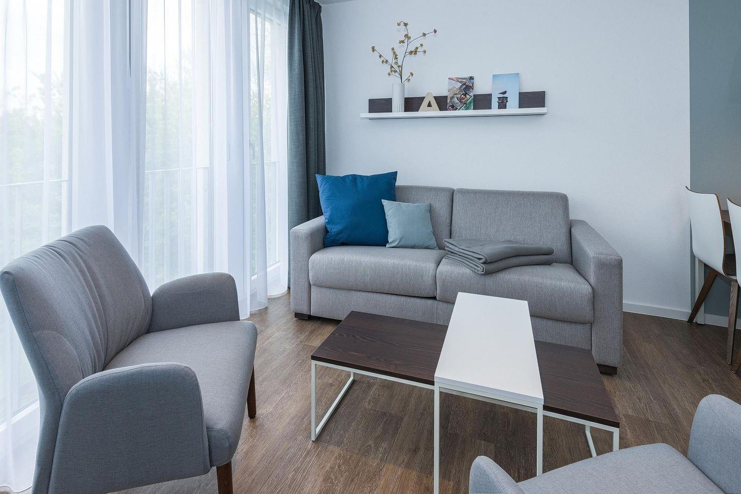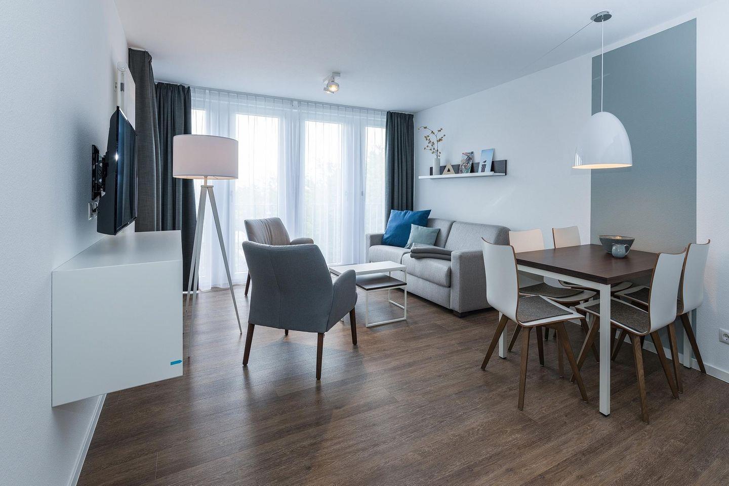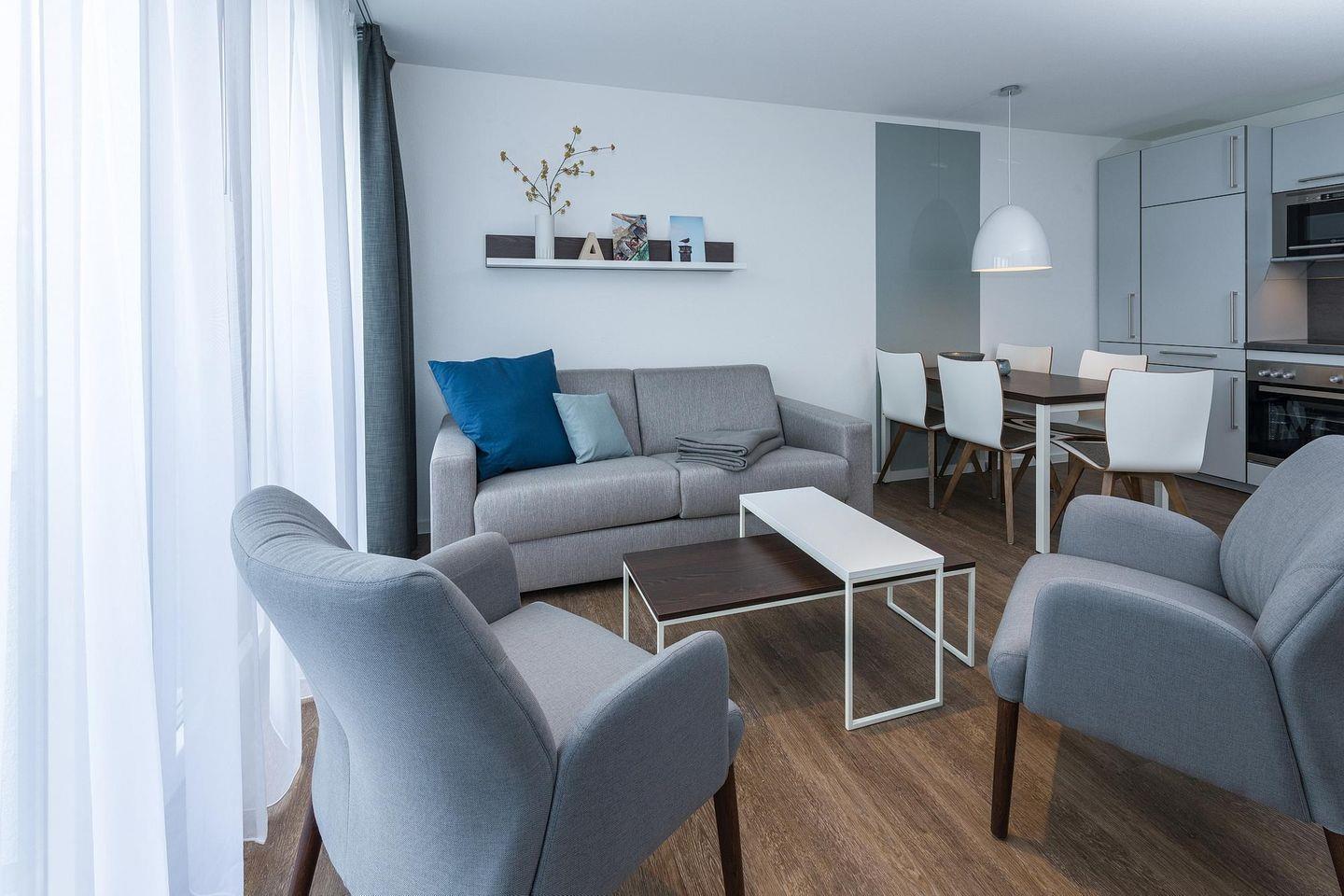 Das geschmackvoll eingerichtete Nichtraucher-Apartment verfügt über kostenfreies WLAN. Der Wohnbereich mit Schlafcouch bietet eine voll ausgestattete offene Küchenzeile mit Geschirrspüler, Gefrierfach, Kaffeemaschine, Toaster, Wasserkocher, Backofen und Mikrowelle sowie einen großen Flatscreen-TV und ein Radio. Das Apartment verfügt über einen Esstisch für 5 Personen und einen behaglichen Sitzbereich. Zwei separate Schlafzimmer stehen euch zur Verfügung. Eines davon verfügt über ein Doppelbett und einen eigenen Flatscreen-TV, ein weiteres über zwei Einzelbetten. Ein Kinderbett kann gegen Entgelt aufgestellt werden. Im stilvollen Badezimmer befinden sich eine große begehbare Dusche sowie ein Waschtisch mit Föhn und Kosmetikspiegel. Nach einem erlebnisreichen Urlaubstag entspannt ihr auf dem überdachten und mit Gartenmöbeln für 4 Personen ausgestatteten Balkon.