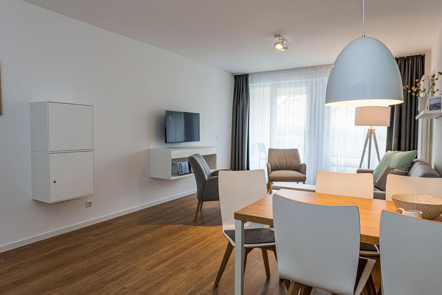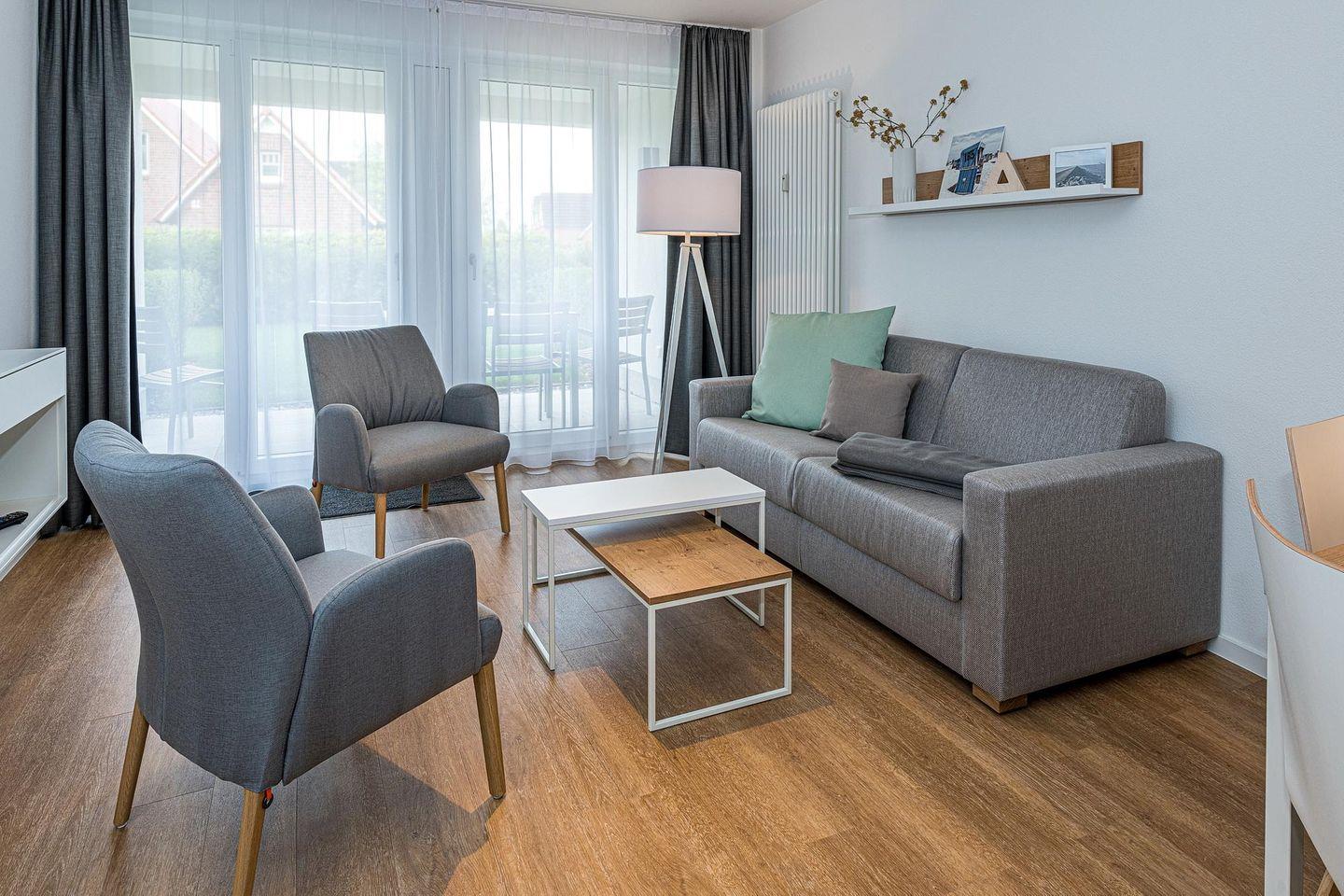 Modernes Apartment in Bensersiel, 500m vom Strand, mit Terrasse, Pool- und Saunanutzung sowie kostenfreiem Parkplatz.