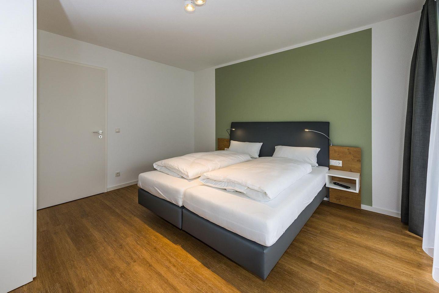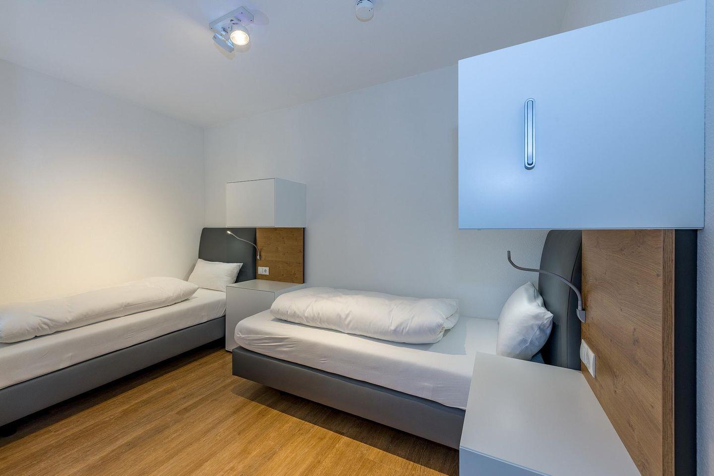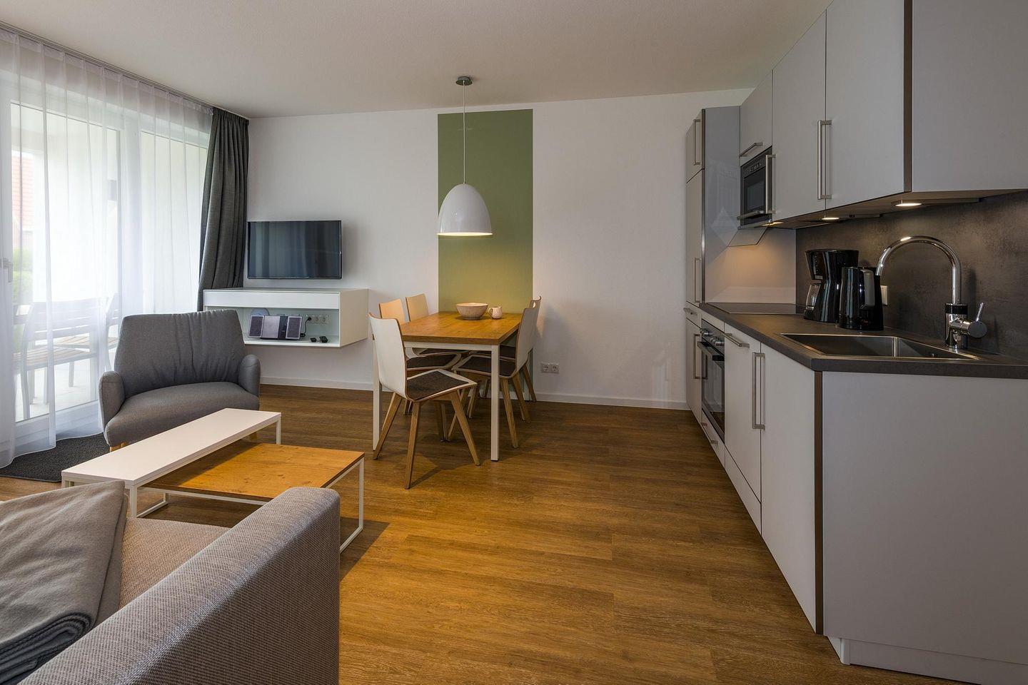 Das geschmackvoll eingerichtete Nichtraucher-Apartment verfügt über kostenfreies WLAN. Der Wohnbereich mit einer Schlafcouch bietet eine voll ausgestattete offene Küchenzeile mit Geschirrspüler, Gefrierfach, Kaffeemaschine, Toaster, Wasserkocher; Backofen und Mikrowelle sowie einen großen Flatscreen-TV und ein Radio. Das Apartment verfügt über einen Esstisch für 5 Personen und einen behaglichen Sitzbereich. Zwei separate Schlafzimmer mit jeweils einem Doppelbett und zwei Einzelbetten (Alkoven) stehen euch zur Verfügung. Eines davon verfügt zudem über einen eigenen Flatscreen-TV. Ein Kinderbett kann gegen Entgelt aufgestellt werden. Im stilvollen Badezimmer befinden sich eine große begehbare Dusche sowie ein Waschtisch mit Föhn und Kosmetikspiegel. Nach einem erlebnisreichen Urlaubstag entspannt ihr auf den überdachten und mit Gartenmöbeln für 5 Personen ausgestatteten Terrassen.