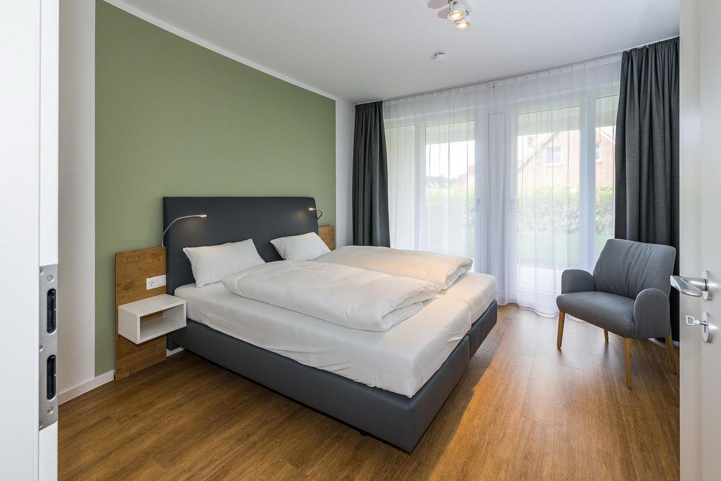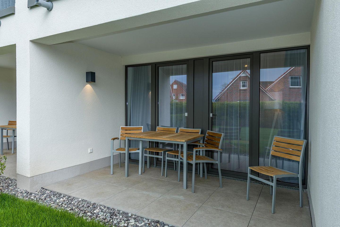 Modernes, strandnahes Ferienapartment in Bensersiel mit Terrasse, Parkplatz, Schwimmbad- und Saunanutzung.