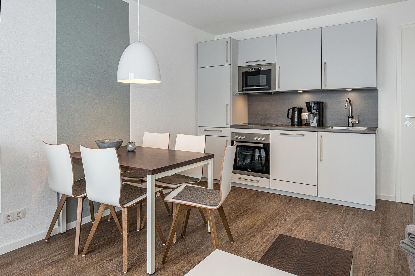 Die moderne und helle Ferienwohnung befindet sich im zweiten Obergeschoss des Deichhauses 7, im Herzen von Bensersiel, nur 500 Meter vom Sandstrand und der Nordsee entfernt. In der unmittelbaren Umgebung findet ihr zahlreiche Einkaufsmöglichkeiten, Restaurants und Cafés; auch die Nordseetherme, das Meerwasserfreibad mit großer Wasserrutsche und der Sportthemenpark sind fußläufig gut erreichbar. Unser Tipp: Macht einen Tagesausflug nach Langeoog - die knapp einstündige Fährverbindung zwischen Bensersiel und der autofreien Insel verkehrt mehrfach täglich. Der Fähranleger liegt nur einen kleinen Spaziergang (ca. 1 km) von den Deichhäusern entfernt.