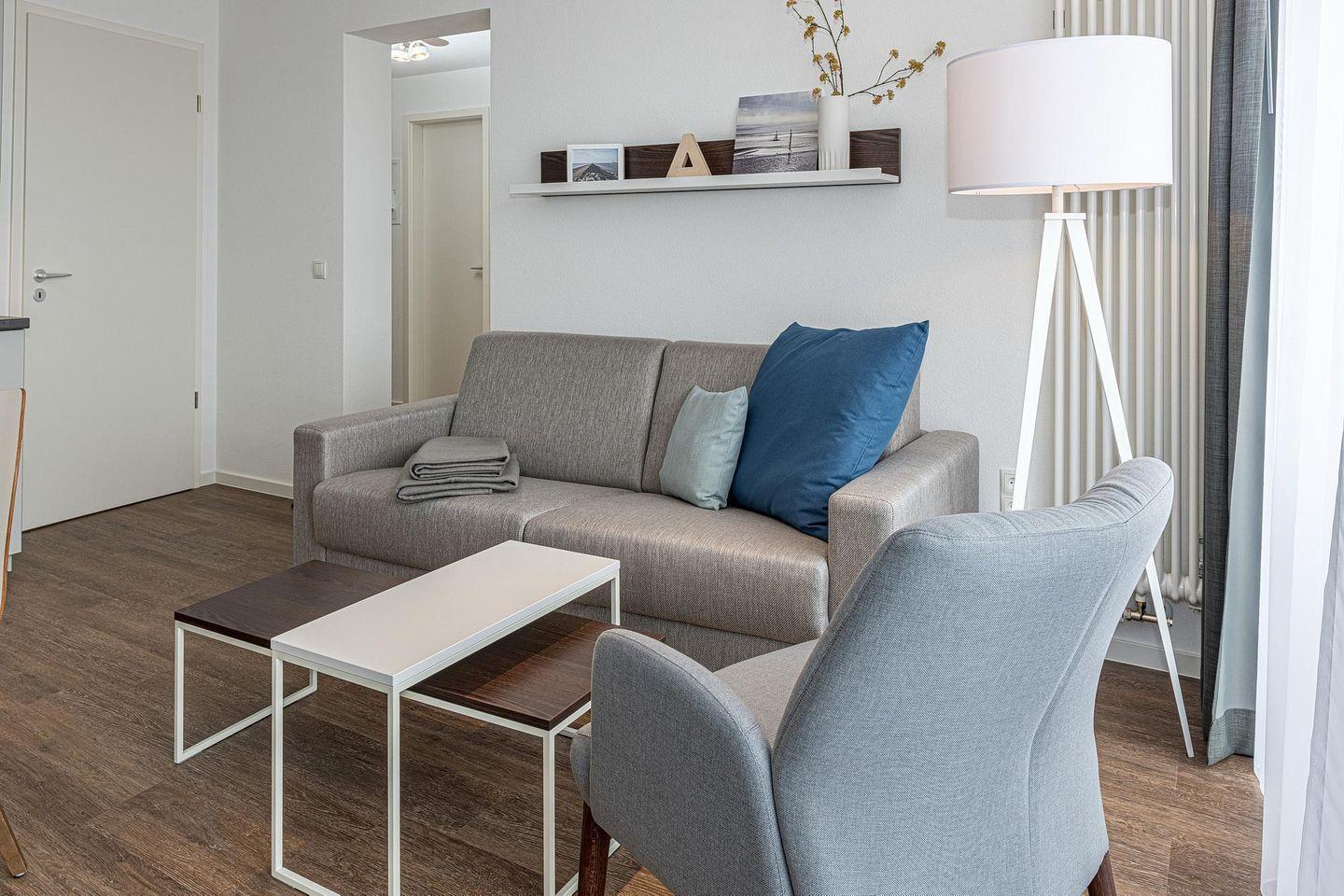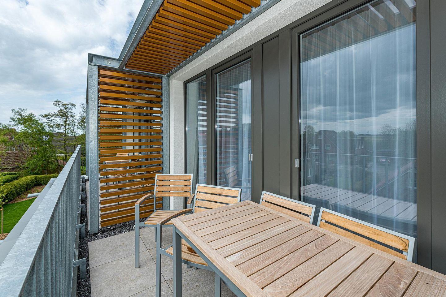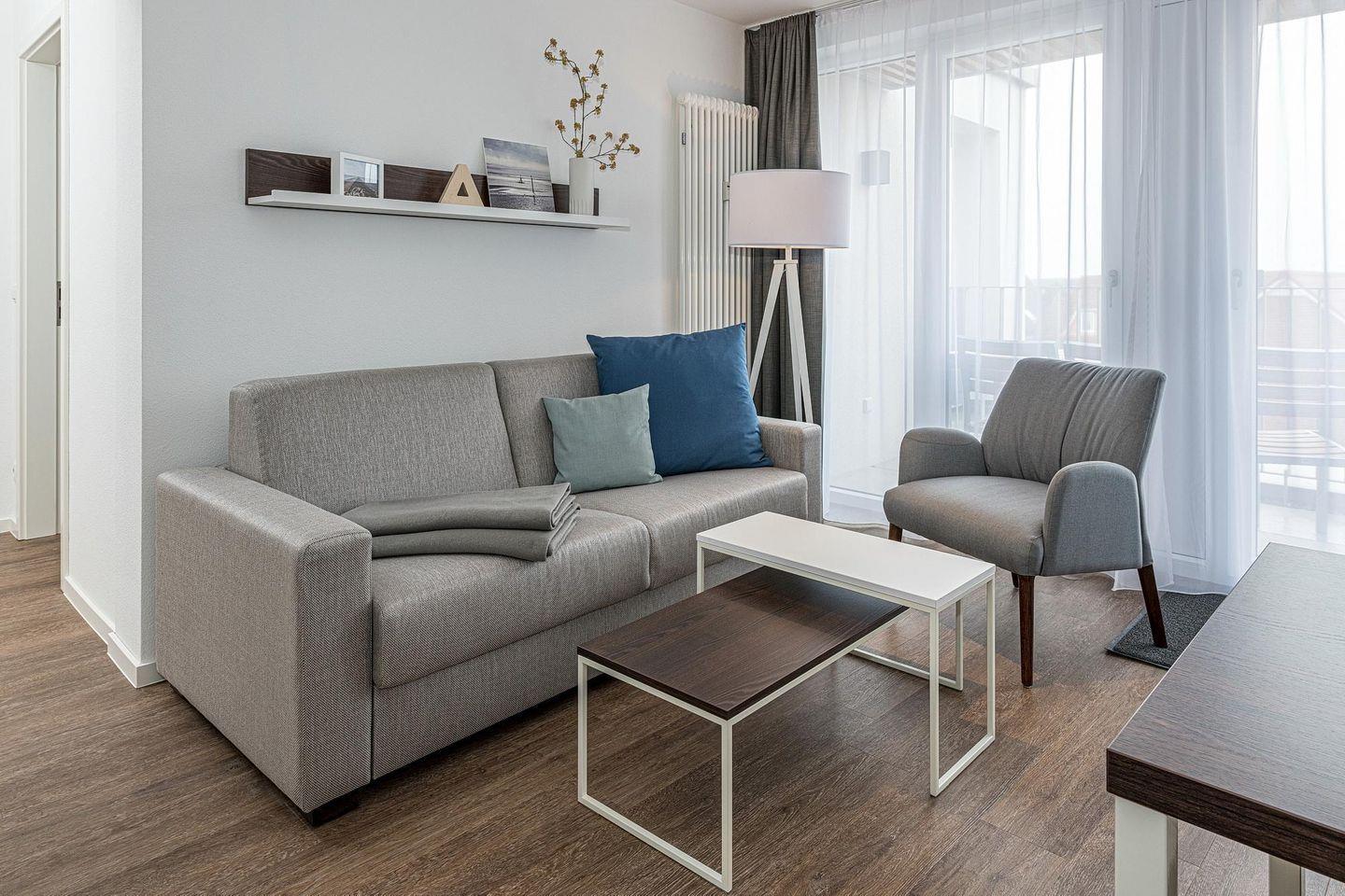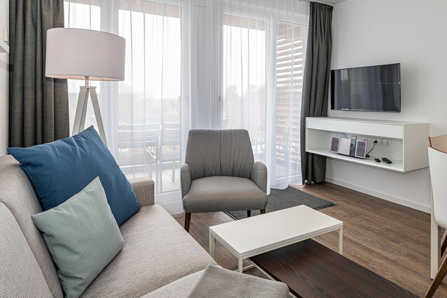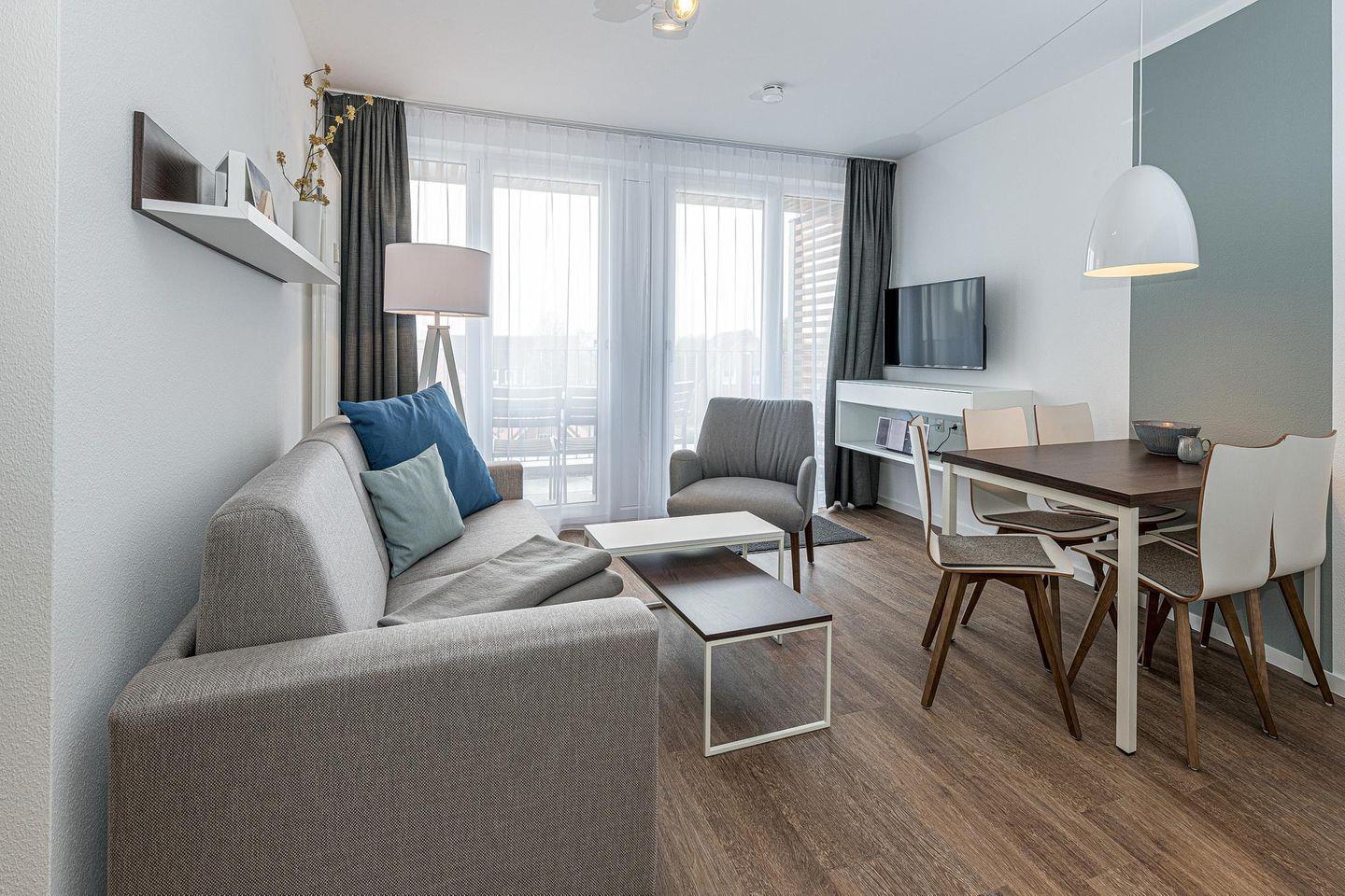 Strandnahes Ferienapartment in Bensersiel mit Balkonen, Schwimmbad- und Saunanutzung sowie kostenfreiem Parkplatz.