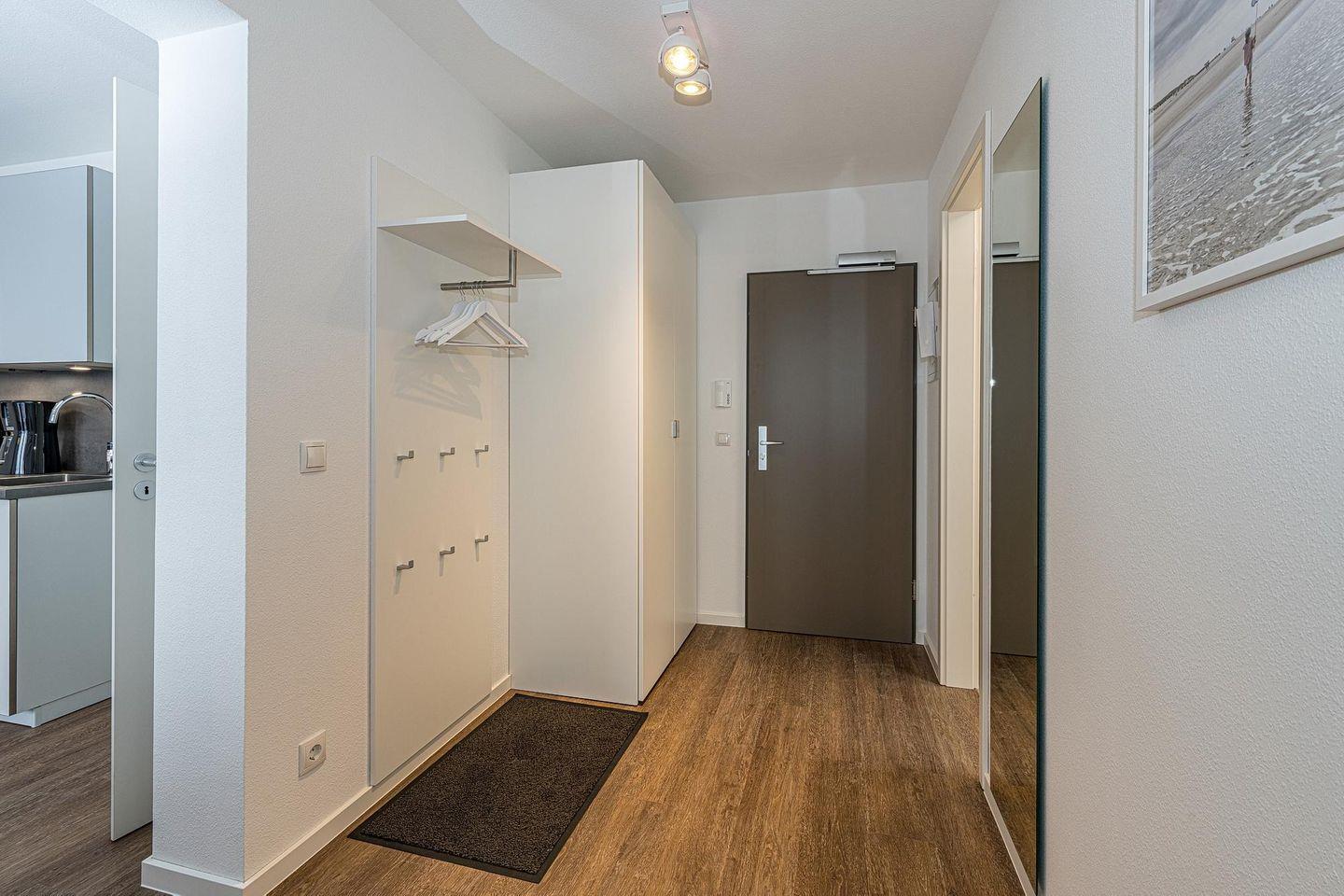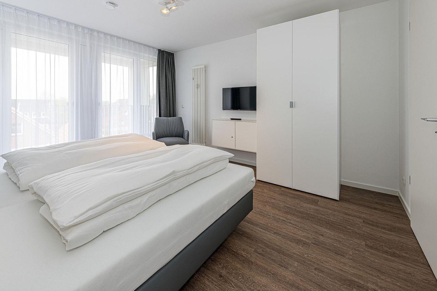 Die 59 m² große 3-Zimmer Ferienwohnung ist für bis zu 5 Personen geeignet. Besonders hervorzuheben sind die zwei großzügigen und überdachten Balkone in sonniger Süd-West-Lage. Hier lässt sich den ganzen Tag das wohltuende Meeresklima des Nordseeheilbades genießen. Die Wohnung verfügt über elektrische Außenrolladen zur Verdunklung und für ein angenehmes Raumklima.