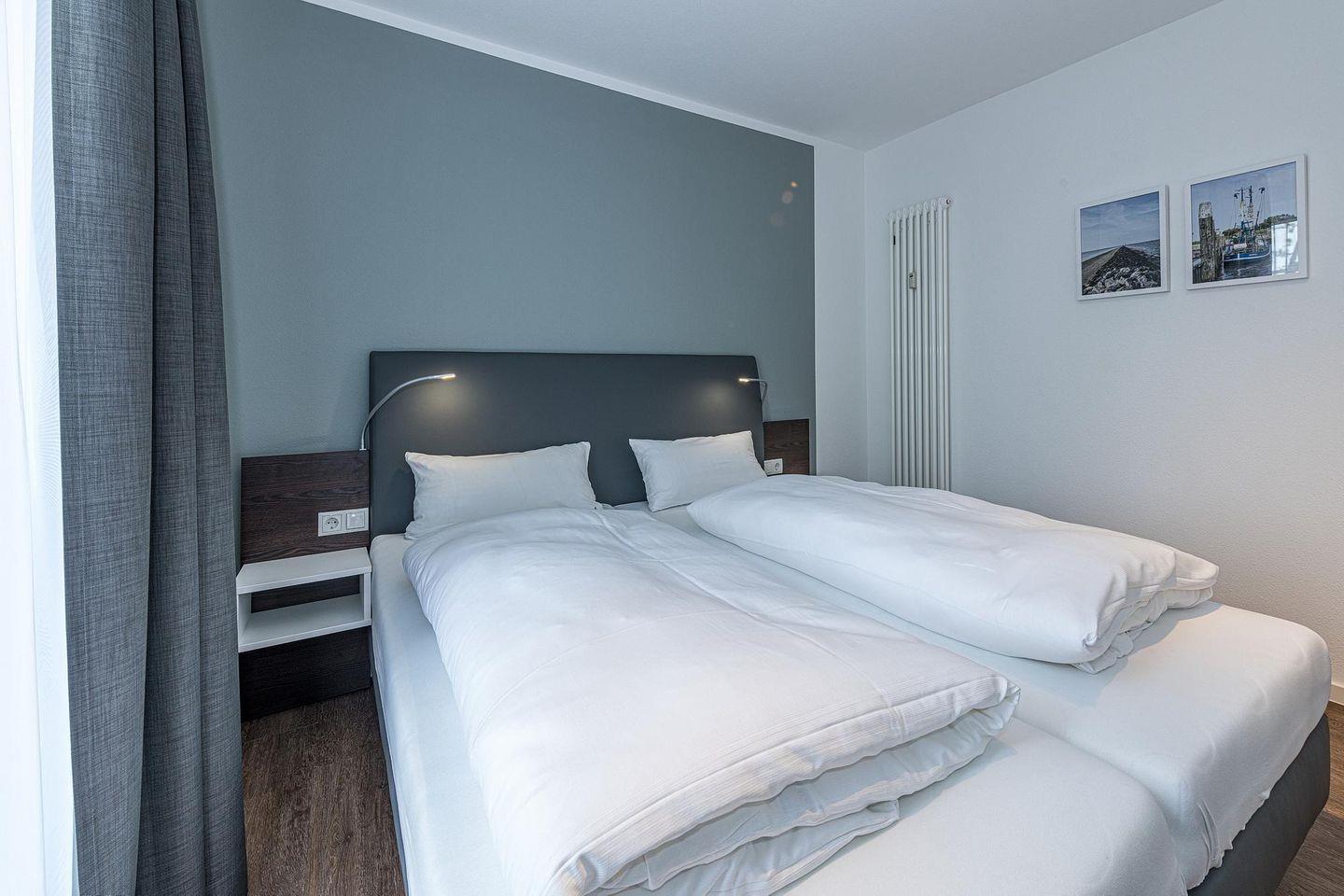 Das geschmackvoll eingerichtete Nichtraucher-Apartment verfügt über kostenfreies WLAN. Der Wohnbereich bietet eine voll ausgestattete offene Küchenzeile mit Geschirrspüler, Gefrierfach, Backofen, Kaffeemaschine, Toaster, Wasserkocher und Mikrowelle sowie einen großen Flatscreen-TV und ein Radio. Das Apartment verfügt über einen Esstisch für 5 Personen und einen behaglichen Sitzbereich. Zwei separate Schlafzimmer mit einem Doppelbett bzw. einem Etagenbett stehen euch zur Verfügung. Eines davon verfügt zudem über einen eigenen Flatscreen-TV. Im stilvollen Badezimmer befinden sich eine große begehbare Dusche sowie ein Waschtisch mit Föhn und Kosmetikspiegel. Nach einem erlebnisreichen Urlaubstag entspannt ihr auf der überdachten und mit Gartenmöbeln für 5 Personen ausgestatteten Terrasse. Die Terrasse ist vom Wohnbereich zugänglich.