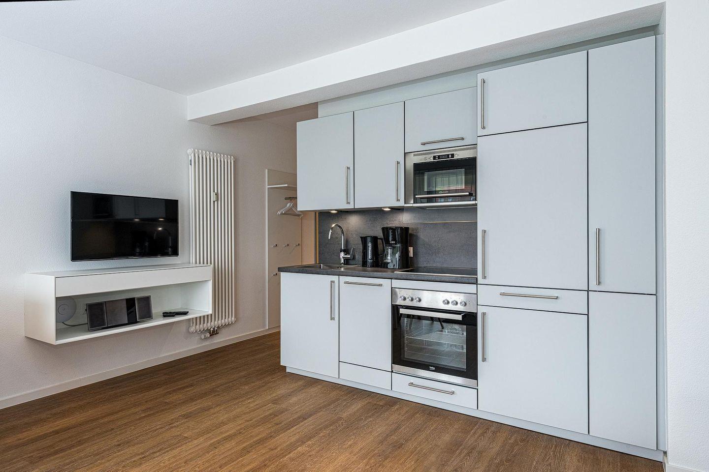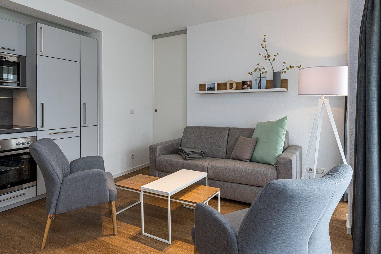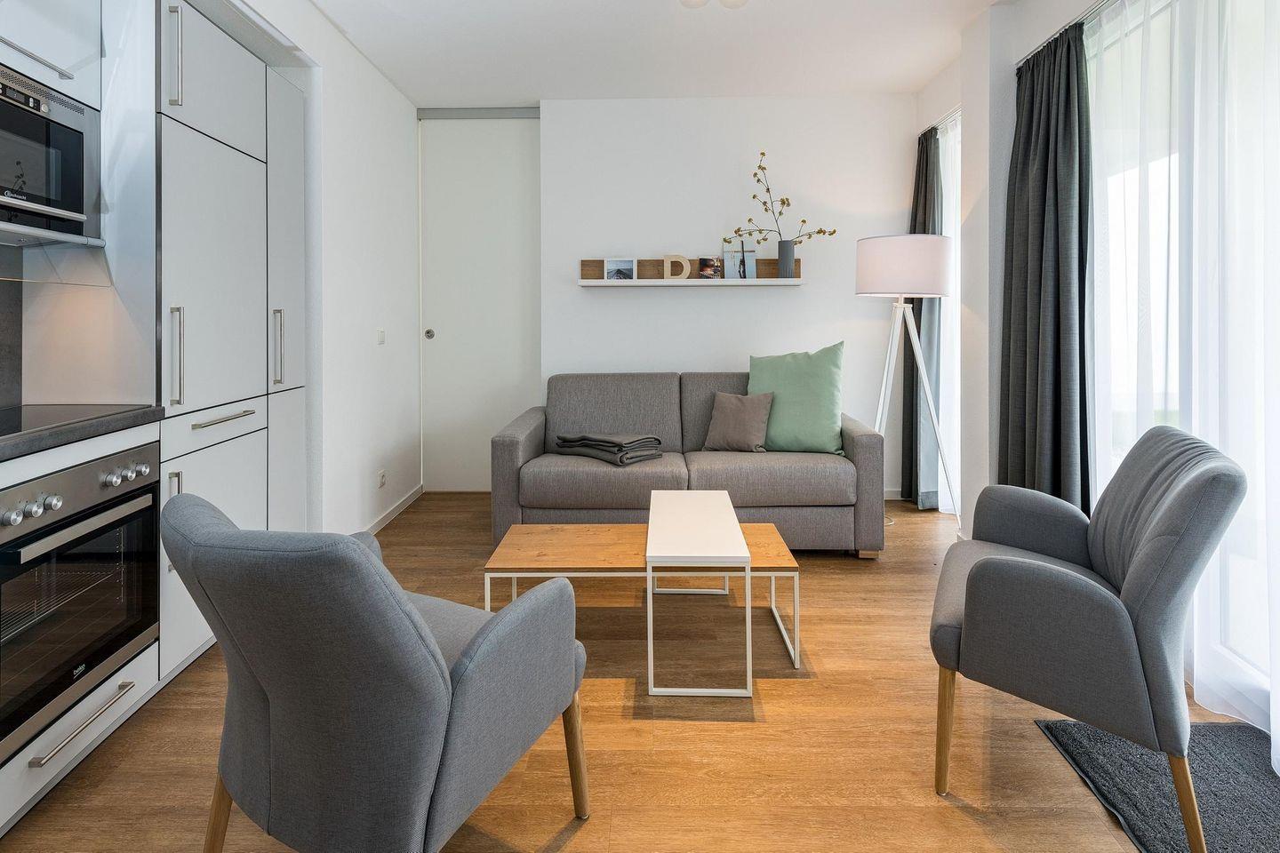 Das geschmackvoll eingerichtete Nichtraucher-Apartment verfügt über kostenfreies WLAN. Der Wohnbereich mit Schlafcouch bietet eine voll ausgestattete offene Küchenzeile mit Geschirrspüler, Gefrierfach, Kaffeemaschine, Toaster, Wasserkocher, Mikrowelle und Backofen sowie einen großen Flatscreen-TV und ein Radio. Das Apartment verfügt über einen Esstisch und einen behaglichen Sitzbereich. Ein Schlafzimmer mit einem Doppelbett und einem Flatscreen-TV steht euch zur Verfügung. Im stilvollen Badezimmer befinden sich eine große begehbare Dusche sowie ein Waschtisch mit Föhn und Kosmetikspiegel. Nach einem erlebnisreichen Urlaubstag entspannt ihr auf der überdachten und mit Gartenmöbeln für 5 Personen ausgestattete Terrasse.