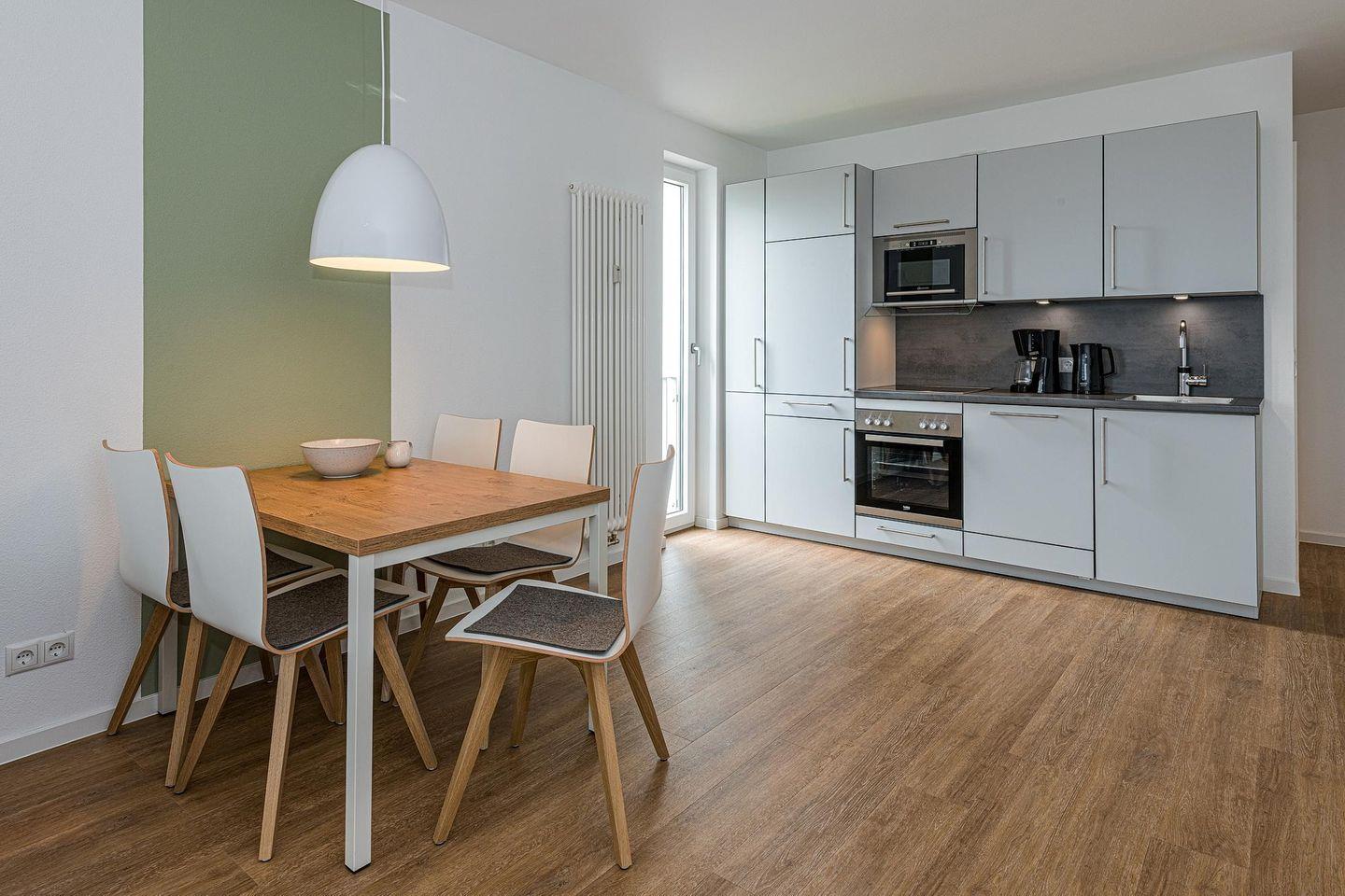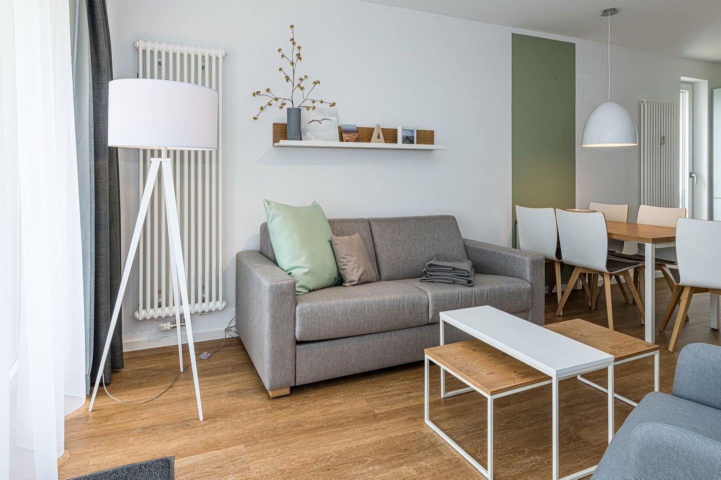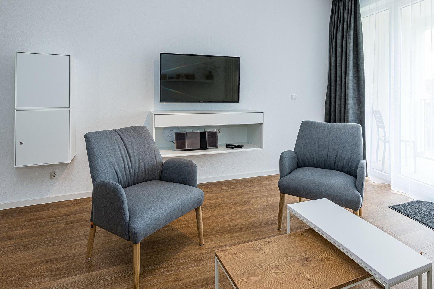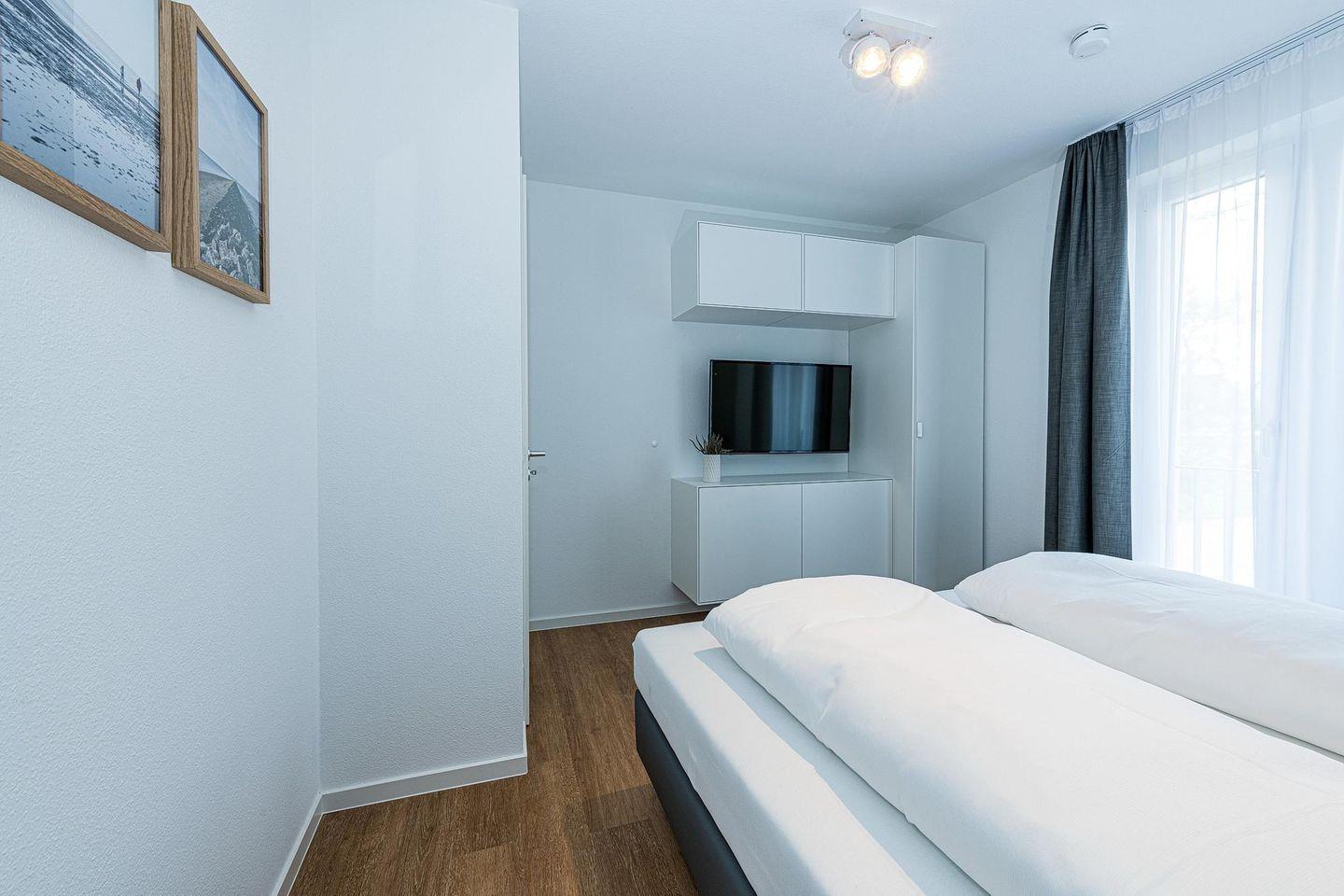 Das geschmackvoll eingerichtete Nichtraucher-Apartment verfügt über kostenfreies WLAN. Der Wohnbereich mit Schlafcouch, bietet eine voll ausgestattete offene Küchenzeile mit Geschirrspüler, Gefrierfach, Kaffeemaschine, Toaster, Wasserkocher, Backofen und Mikrowelle sowie einen großen Flatscreen-TV und ein Radio. Das Apartment verfügt über einen Esstisch für 5 Personen und einen behaglichen Sitzbereich. Zwei separate Schlafzimmer stehen euch zur Verfügung. Eines davon verfügt über ein Doppelbett und einen eigenen Flatscreen-TV, ein weiteres über ein Etagenbett. Ein Kinderbett kann gegen Entgelt aufgestellt werden. Im stilvollen Badezimmer befinden sich eine große begehbare Dusche sowie ein Waschtisch mit Föhn und Kosmetikspiegel. Nach einem erlebnisreichen Urlaubstag lässt sich auf dem überdachten und mit Gartenmöbeln ausgestatteten Balkon wunderbar entspannen.