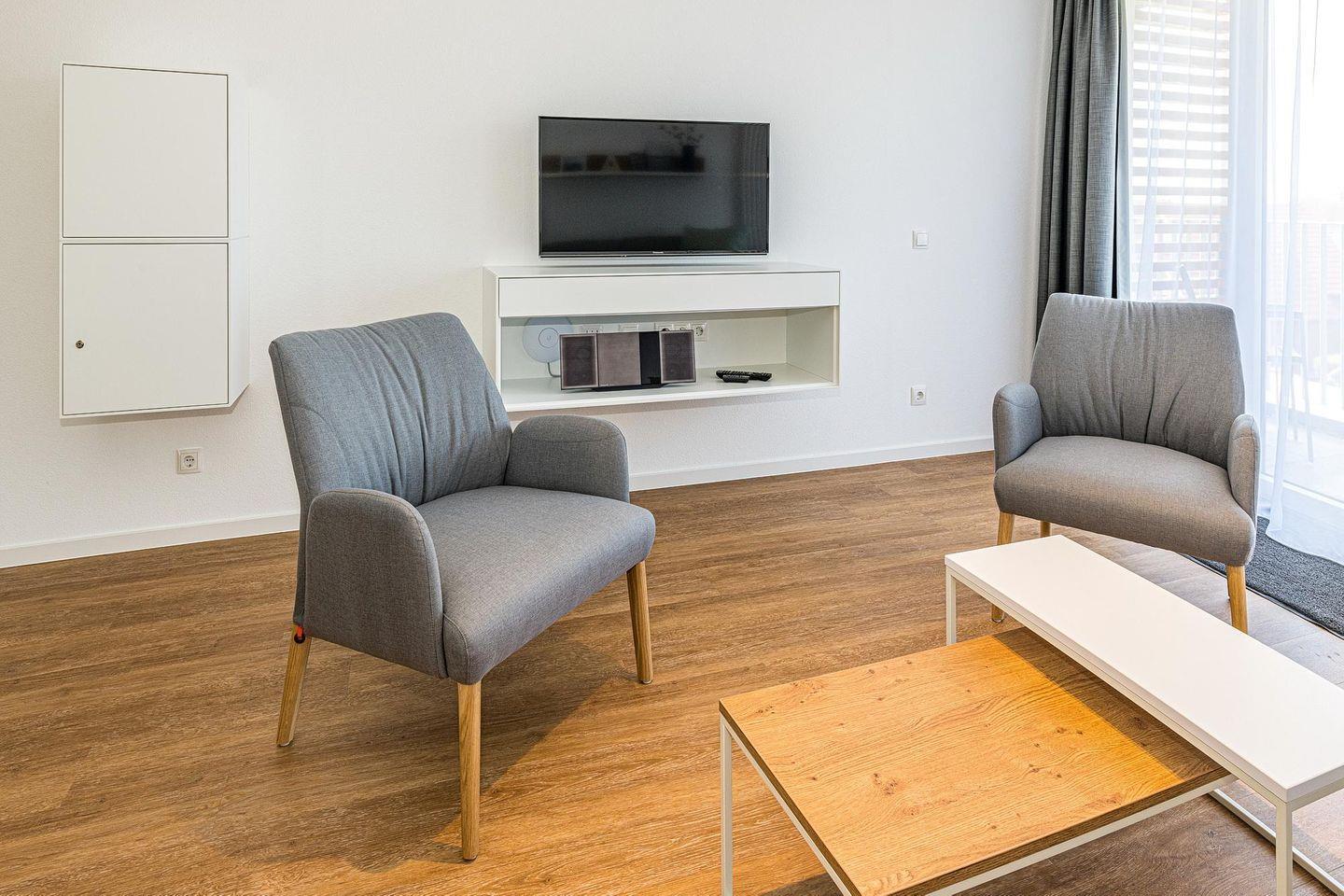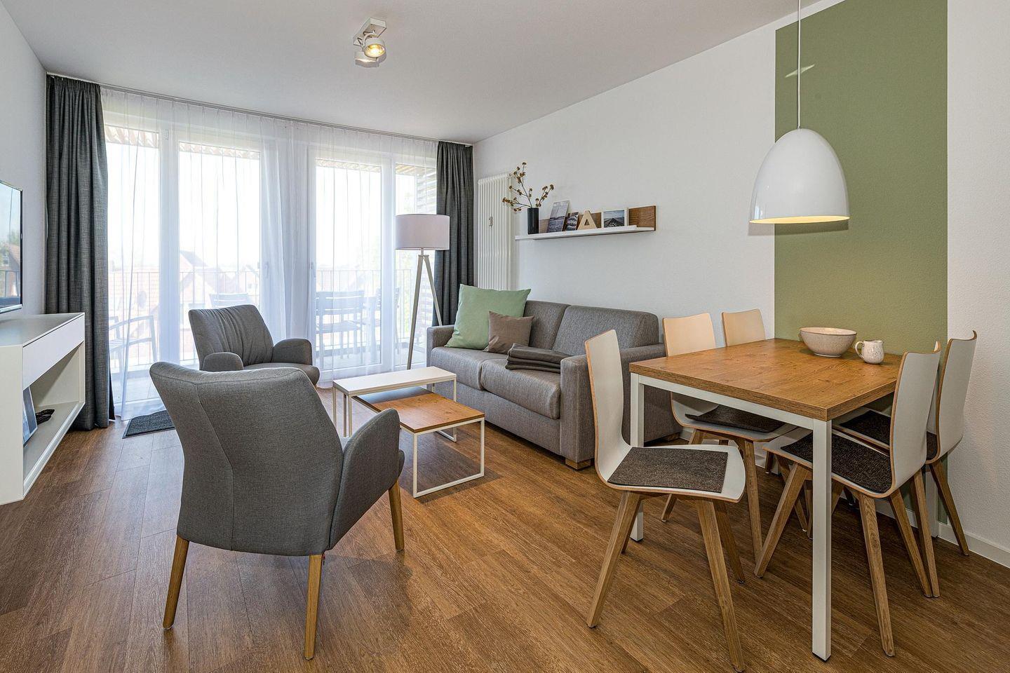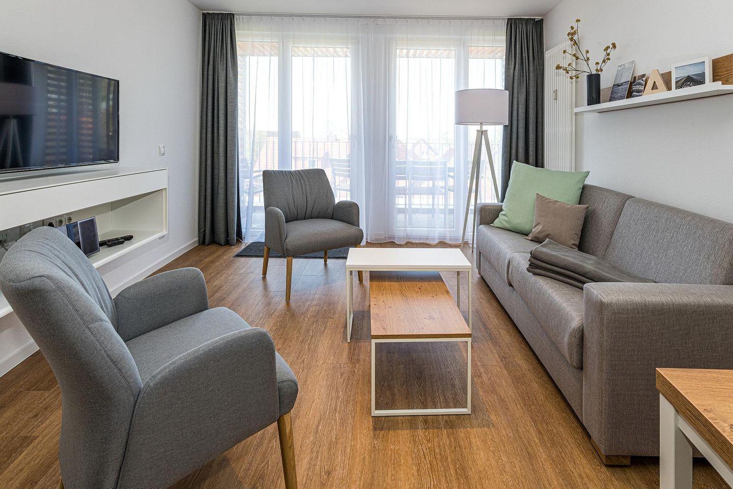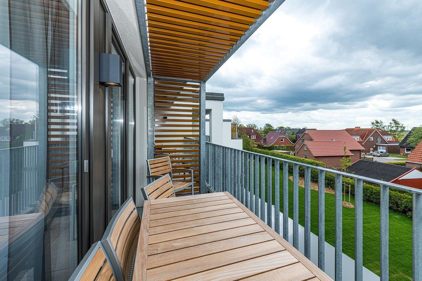 Moderne Ferienwohnung in Bensersiel mit Balkon, WLAN, Schwimmbad- und Saunanutzung, nur 500 m vom Nordseestrand entfernt.