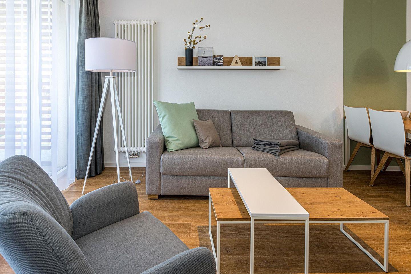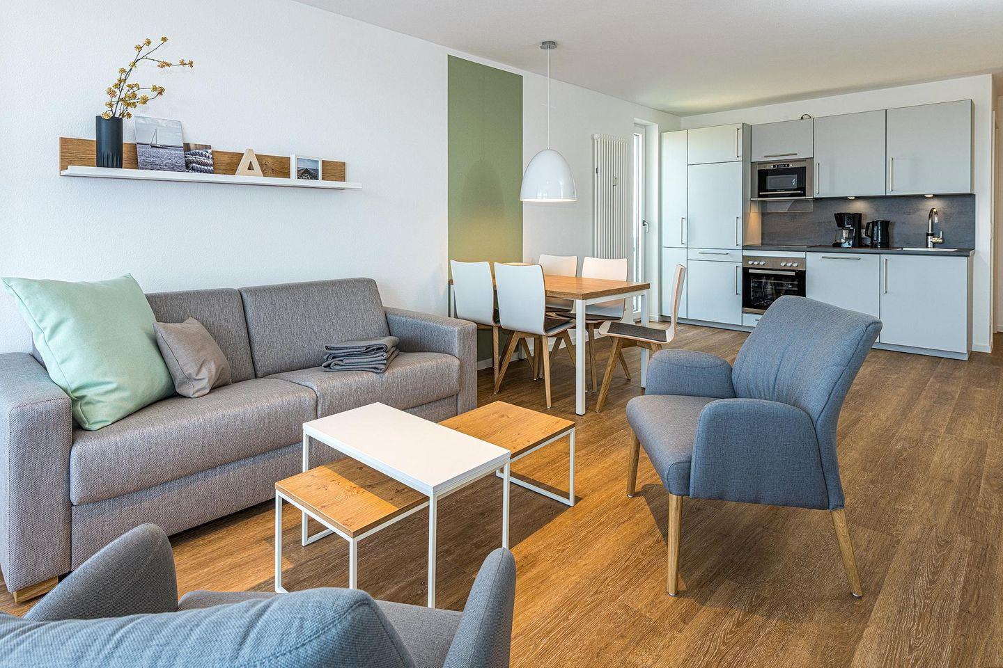 Das geschmackvoll eingerichtete Nichtraucher-Apartment verfügt über kostenfreies WLAN. Der Wohnbereich bietet eine voll ausgestattete offene Küchenzeile mit Geschirrspüler, Gefrierfach, Backofen, Kaffeemaschine, Toaster, Wasserkocher und Mikrowelle sowie einen großen Flatscreen-TV und ein Radio. Das Apartment verfügt über einen Esstisch für 4 Personen und einen behaglichen Sitzbereich. Zwei separate Schlafzimmer stehen euch zur Verfügung. Eines davon verfügt über ein Doppelbett und einen eigenen Flatscreen-TV, ein weiteres über ein Etagenbett. Ein Kinderbett kann gegen Entgelt aufgestellt werden. Im stilvollen Badezimmer befinden sich eine große begehbare Dusche sowie ein Waschtisch mit Föhn und Kosmetikspiegel. Nach einem erlebnisreichen Urlaubstag entspannt ihr auf dem überdachten und mit Gartenmöbeln für 4 Personen ausgestatteten Balkon.