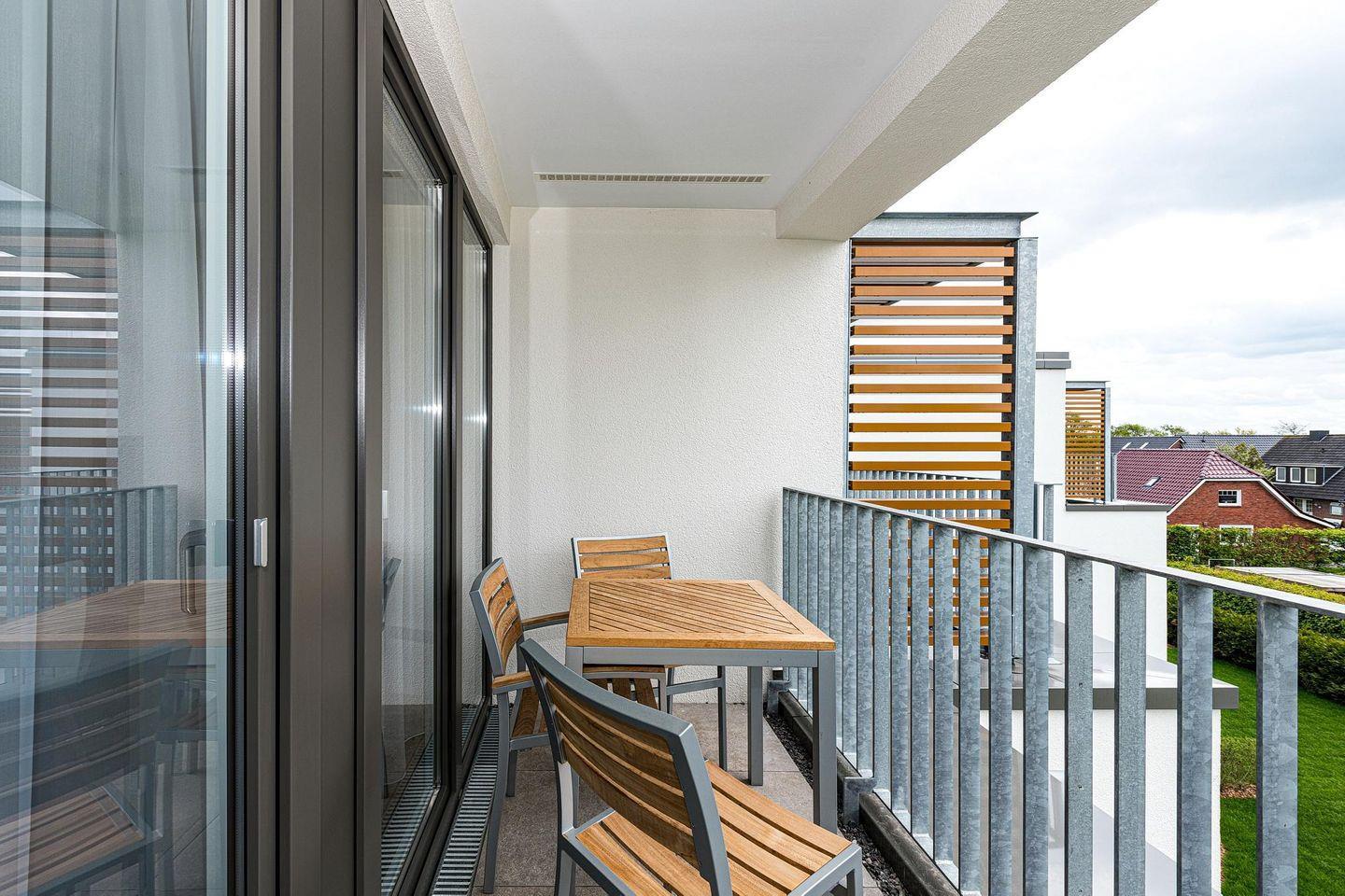 Modernes Ferienapartment mit Balkon nahe Nordsee, Schwimmbad- und Saunanutzung inklusive.