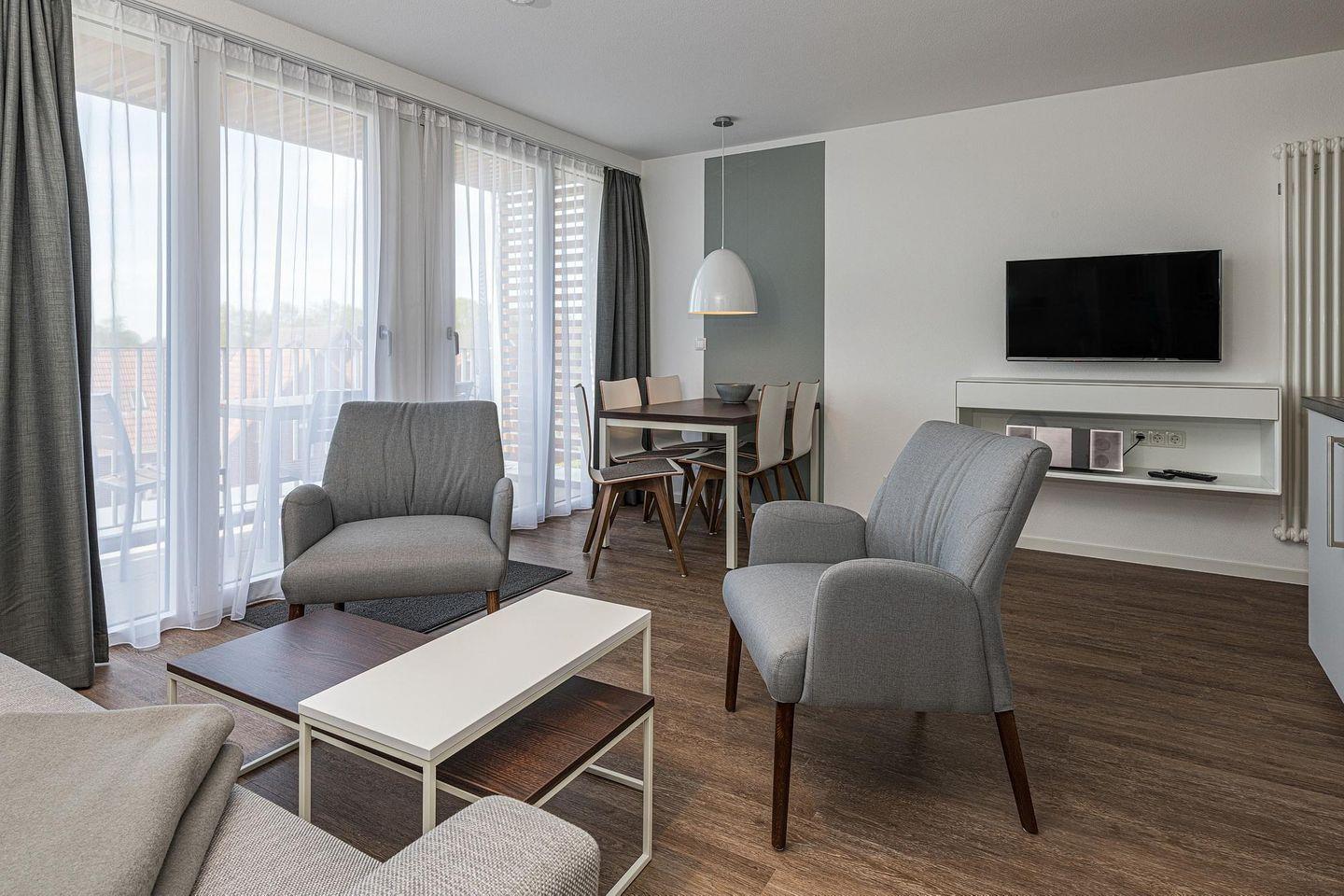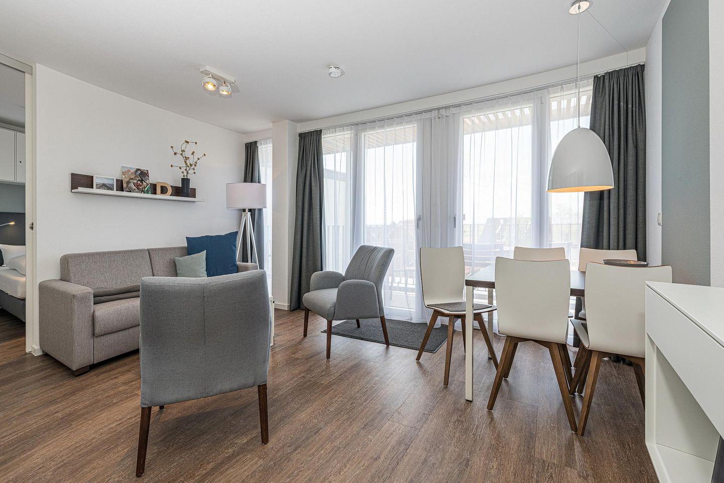 Strandnahes Apartment in Bensersiel mit großem Balkon, Schwimmbad- und Saunanutzung sowie kostenfreiem Parkplatz.