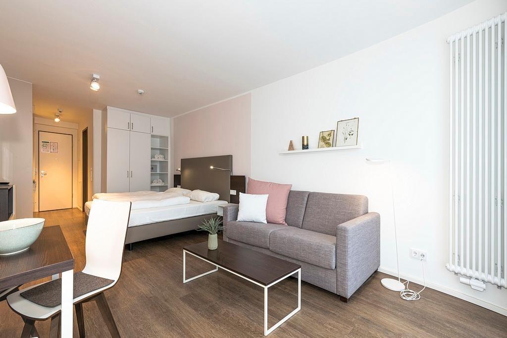 Das barrierearme Nichtraucher-Apartment verfügt über kostenfreies WLAN. Der Wohn- und Schlafraum bietet eine voll ausgestattete offene Küchenzeile mit Geschirrspüler, Gefrierfach, Kaffeemaschine, Toaster, Wasserkocher und Mikrowelle mit Grillfunktion sowie ein Doppelbett, eine Schlafcouch, einen großen Flatscreen-TV und Radio. Das Apartment verfügt über einen kleinen Esstisch und einen behaglichen Sitzbereich. Ein Kinderbett kann gegen Entgelt aufgestellt werden. Im stilvollen Badezimmer befinden sich eine große begehbare Dusche sowie ein Waschtisch mit Föhn und Kosmetikspiegel. Nach einem erholsamen Urlaubstag lässt es sich auf der mit Gartenmöbeln ausgestatteten Terrasse herrlich entspannen.