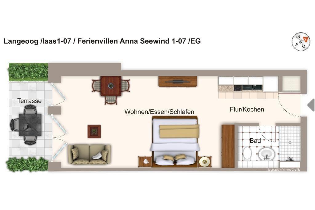 Das 36 m² große 1-Zimmer Apartment ist für bis zu 3 Personen geeignet. Besonders hervorzuheben ist die Terrasse in sonnenreicher Westlage. Hier können Sie sonnige und erholsame Urlaubstage und laue Sommerabende verleben.