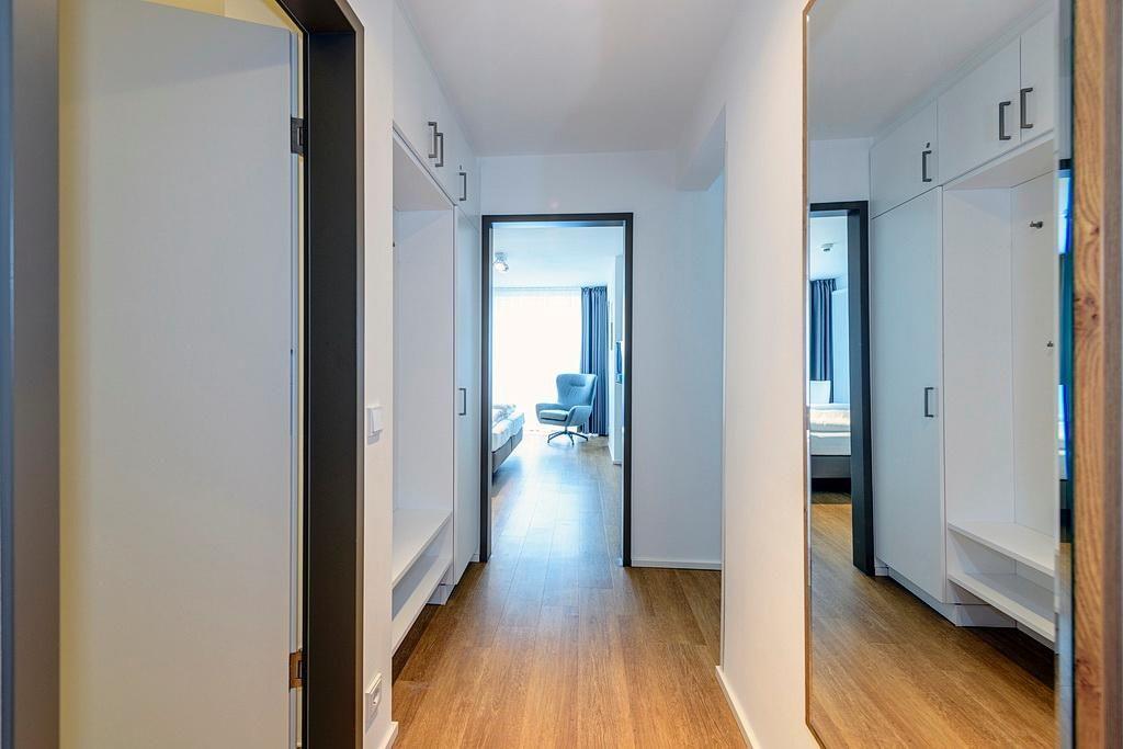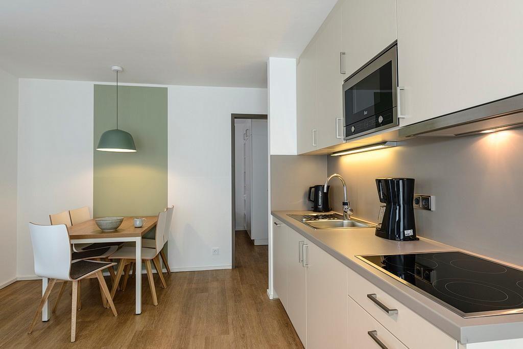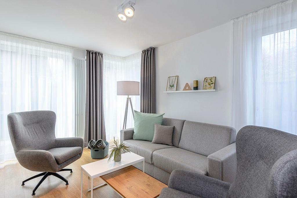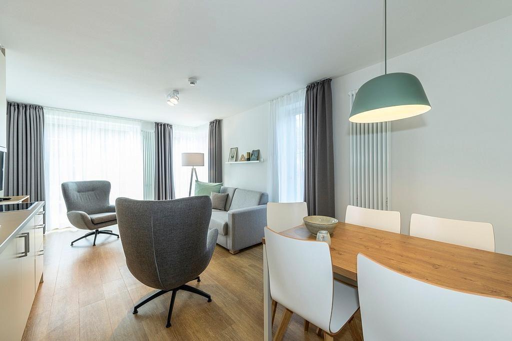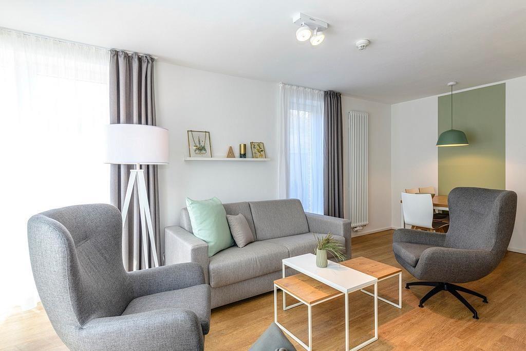 Das barrierearme Nichtraucher-Apartment verfügt über kostenfreies WLAN. Der Wohnbereich bietet eine voll ausgestattete offene Küchenzeile mit Geschirrspüler, Gefrierfach, Kaffeemaschine, Toaster, Wasserkocher und Mikrowelle mit Grillfunktion sowie einen großen Flatscreen-TV mit CD-Player und und Radio. Das Apartment verfügt über einen Esstisch und einen behaglichen Sitzbereich. In den beiden separaten Schlafzimmern befindet sich jeweils ein Doppelbett. Eines der Schlafzimmer verfügt zudem über einen zweiten Flatscreen-TV. Ein Kinderbett kann gegen Entgelt aufgestellt werden. Im stilvollen Badezimmer befinden sich eine große begehbare Dusche, eine Badewanne sowie ein Waschtisch mit Föhn und Kosmetikspiegel. Nach einem erholsamen Urlaubstag lässt es sich auf der privaten Terrasse mit eigenem kleinem Garten herrlich entspannen.