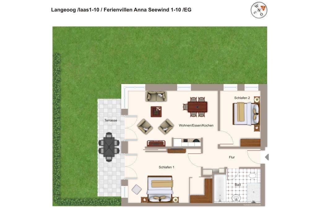 Die moderne und helle Ferienwohnung befindet sich in Nord-West-Lage im Erdgeschoss der Apartmentvilla Anna See, im Langeooger Ortszentrum, an der Barkhausenstraße gelegen. Der weitläufige Sandstrand und die Promenade sind nur 300 Meter entfernt. In der unmittelbaren Umgebung findet ihr zahlreiche Einkaufsmöglichkeiten, Restaurants und Cafés sowie Freizeitangebote wie z.B. das beliebte Meerwasser-Erlebnisbad, den Golfclub und die Kitesurfschule.