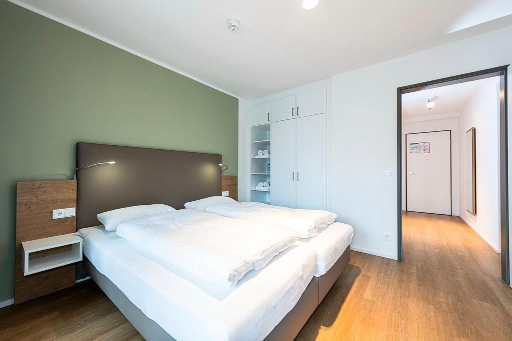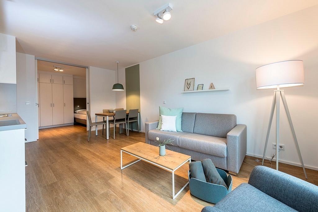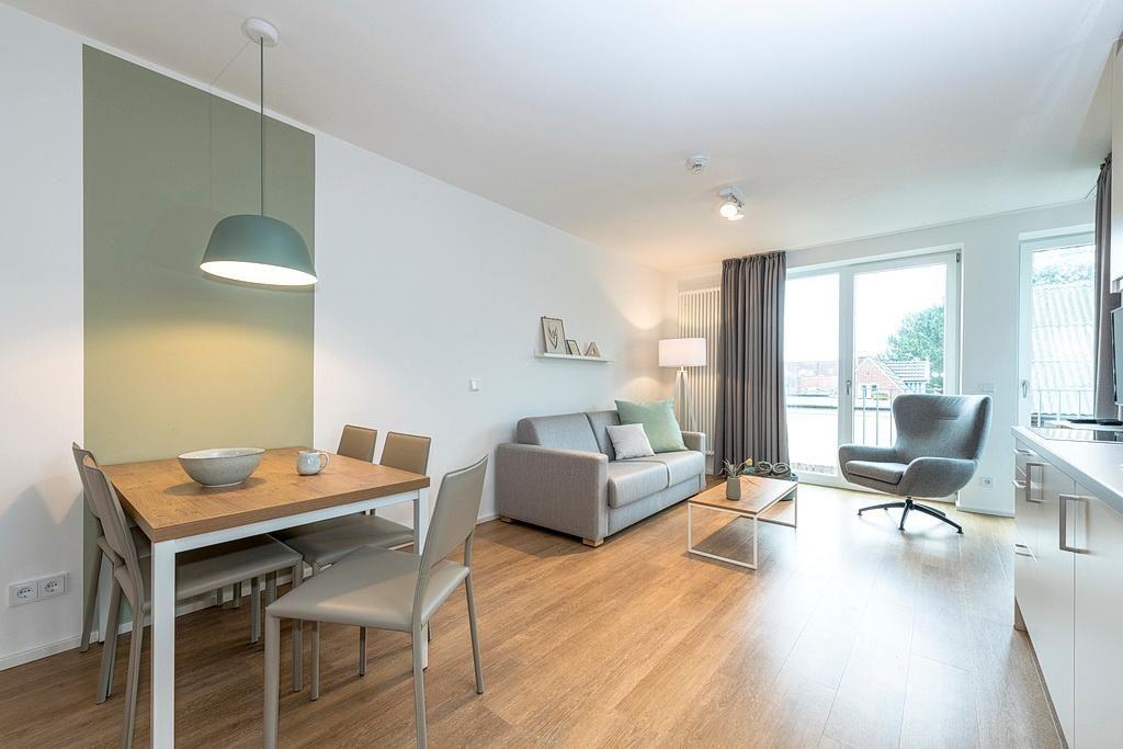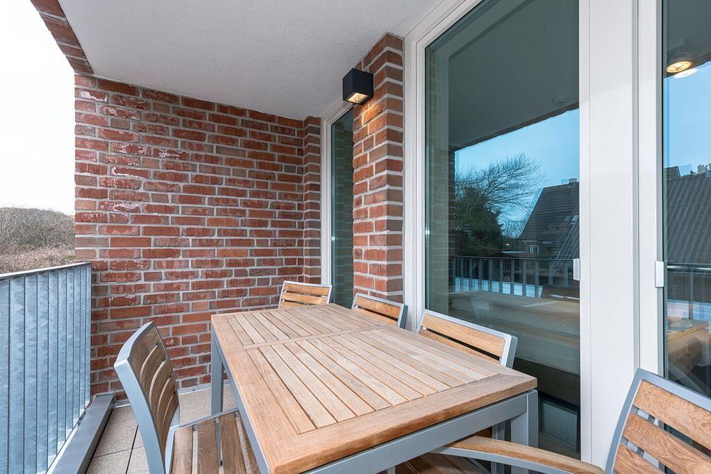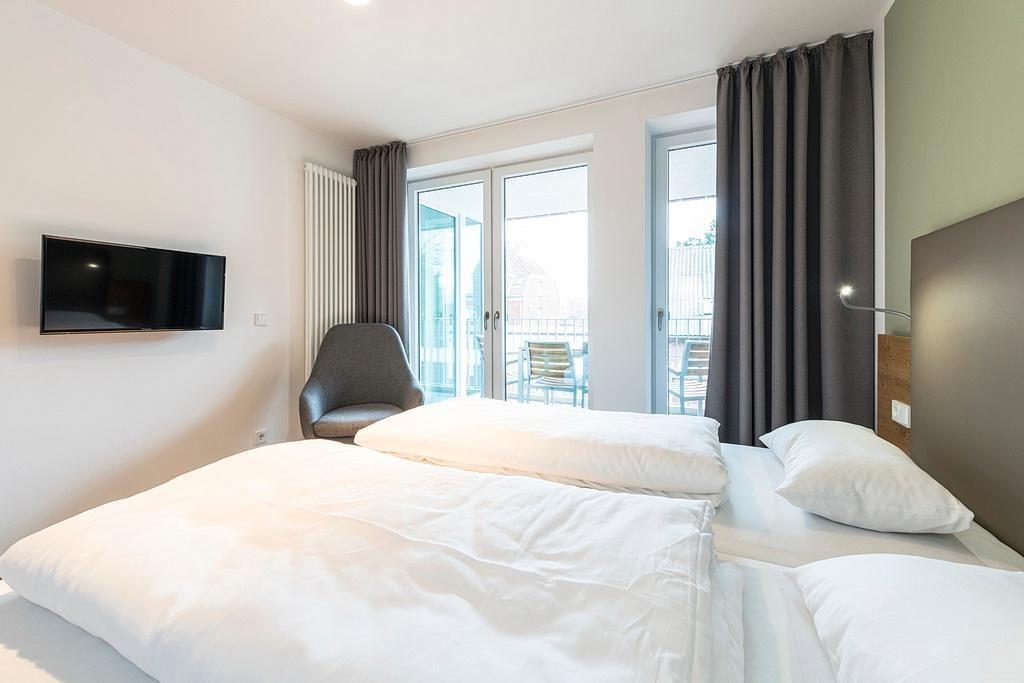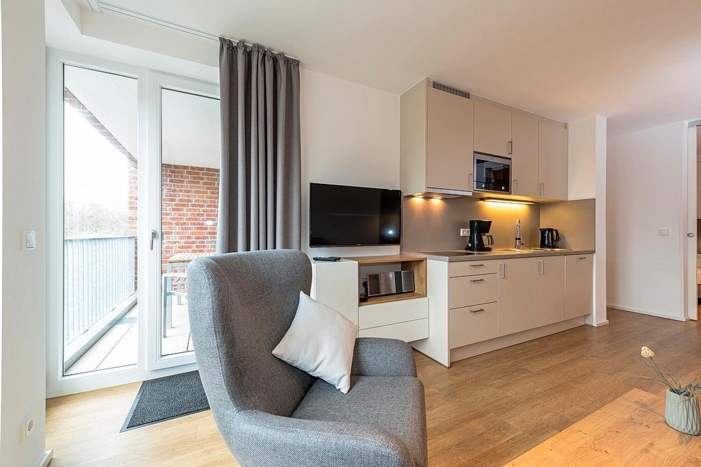 Das barrierearme Nichtraucher-Apartment verfügt über kostenfreies WLAN. Der Wohnbereich bietet eine voll ausgestattete offene Küchenzeile mit Geschirrspüler, Gefrierfach, Kaffeemaschine, Toaster, Wasserkocher und Mikrowelle mit Grillfunktion sowie einen großen Flatscreen-TV und Radio. Das Apartment verfügt über eine Schlafcouch, einen Esstisch und einen behaglichen Sitzbereich. Im separaten Schlafzimmer befindet sich ein Doppelbett und ein zweiter Flatscreen-TV, in einem weiteren Schlafbereich mit Schiebetür stehen euch zwei Einzelbetten zur Verfügung. Ein Kinderbett kann gegen Entgelt aufgestellt werden. Im stilvollen Badezimmer befinden sich eine große begehbare Dusche, eine Badewanne sowie ein Waschtisch mit Föhn und Kosmetikspiegel. Nach einem erholsamen Urlaubstag lässt es sich auf dem sonnigen und geschützten Balkon herrlich entspannen.