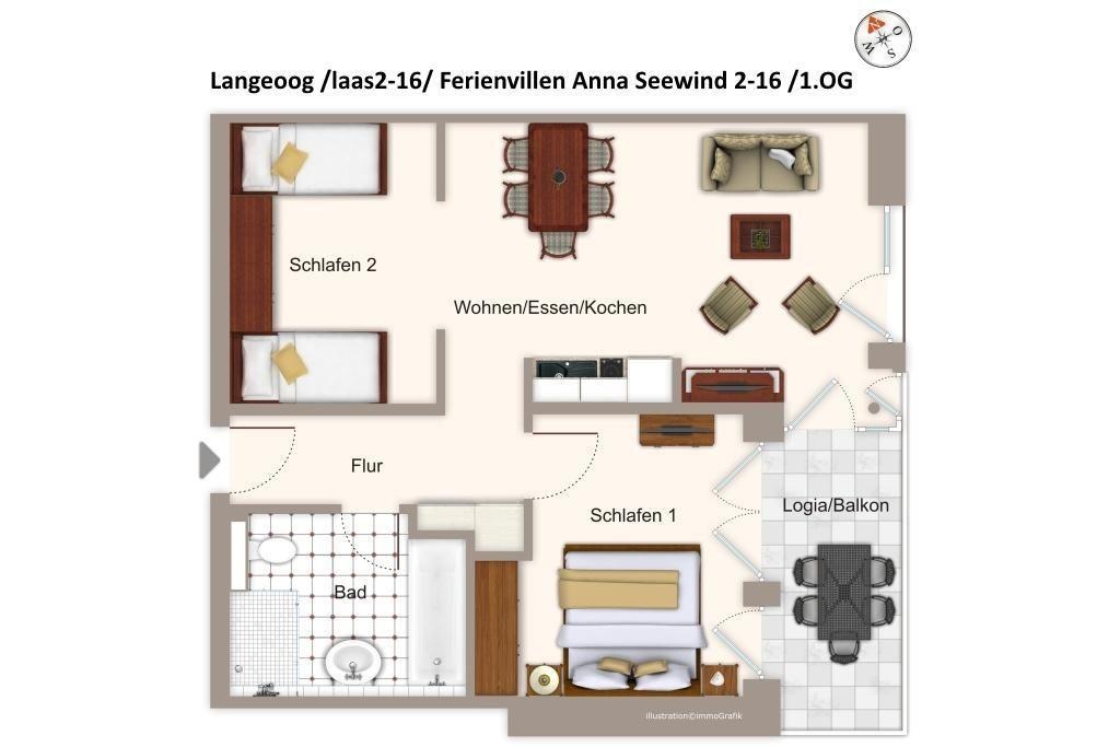 Modernes Familien-Apartment in Langeoog mit sonniger Loggia und Sauna im Haus, nur 300 Meter vom Strand entfernt.
