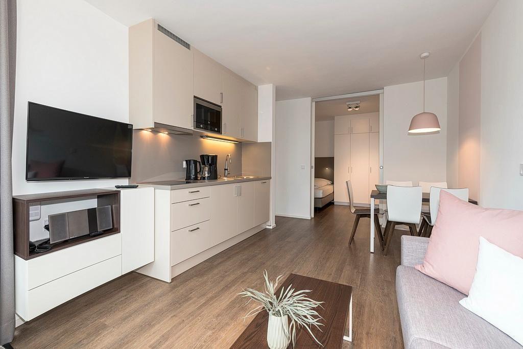Das barrierearme Nichtraucher-Apartment verfügt über kostenfreies WLAN. Der Wohnbereich mit Schlafcouch bietet eine voll ausgestattete offene Küchenzeile mit Geschirrspüler, Gefrierfach, Kaffeemaschine, Toaster, Wasserkocher und Mikrowelle mit Grillfunktion sowie einen großen Flatscreen-TV und Radio. Das Apartment verfügt über einen Esstisch und einen behaglichen Sitzbereich. Im separaten Schlafzimmer befindet sich ein Doppelbett und ein zweiter Flatscreen-TV, in einem weiteren Schlafbereich mit Schiebetür stehen euch zwei Einzelbetten zur Verfügung. Ein Kinderbett kann gegen Entgelt aufgestellt werden. Im stilvollen Badezimmer befinden sich eine große begehbare Dusche, eine Badewanne sowie ein Waschtisch mit Föhn und Kosmetikspiegel. Nach einem erholsamen Urlaubstag lässt es sich auf dem sonnigen und geschützten Balkon herrlich entspannen.