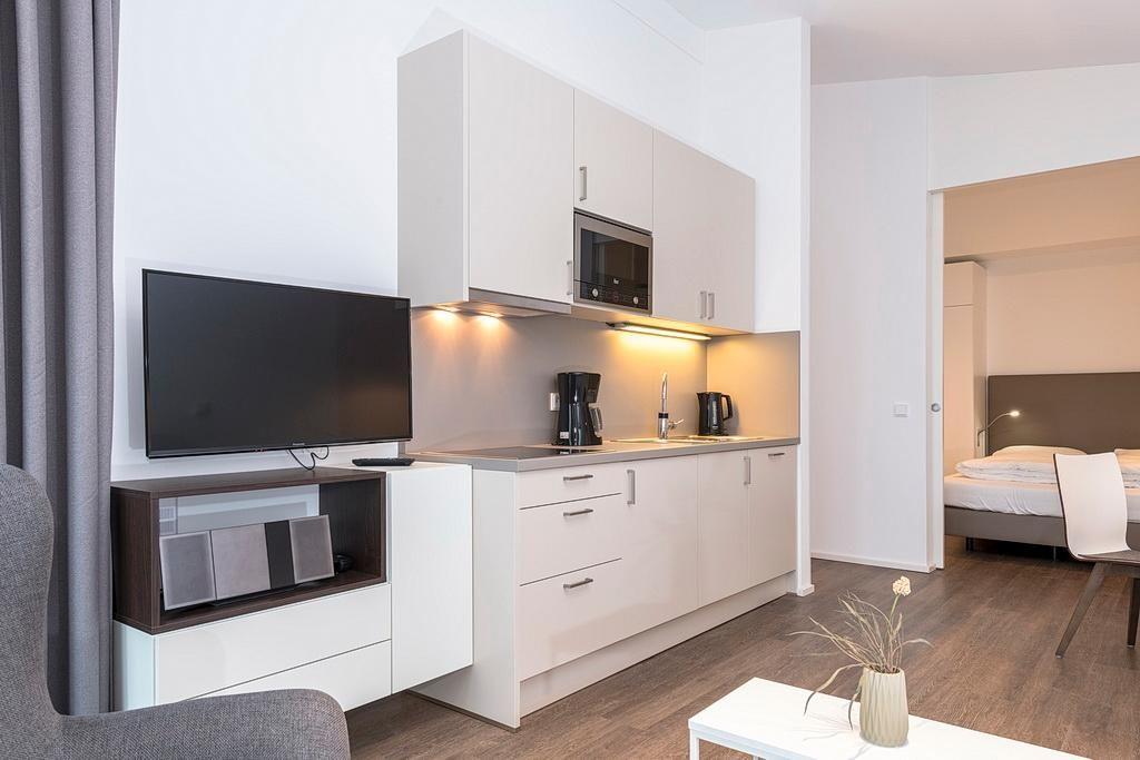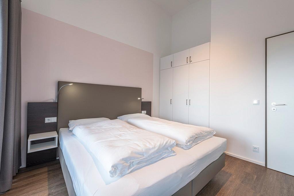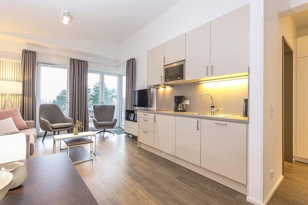 Das barrierearme Nichtraucher-Apartment verfügt über kostenfreies WLAN. Der Wohnbereich bietet eine voll ausgestattete offene Küchenzeile mit Geschirrspüler, Gefrierfach, Kaffeemaschine, Toaster, Wasserkocher und Mikrowelle mit Grillfunktion sowie einen großen Flatscreen-TV und Radio. Das Apartment verfügt über eine Schlafcouch, einen Esstisch und einen behaglichen Sitzbereich. Im separaten Schlafzimmer befindet sich ein Doppelbett und ein zweiter Flatscreen-TV, in einem weiteren Schlafbereich mit Schiebetür steht euch ebenfalls ein Doppelbett zur Verfügung. Ein Kinderbett kann gegen Entgelt aufgestellt werden. Im stilvollen Badezimmer befinden sich eine große begehbare Dusche, eine Badewanne sowie ein Waschtisch mit Föhn und Kosmetikspiegel. Nach einem erholsamen Urlaubstag lässt es sich auf dem sonnigen und geschützten Balkon herrlich entspannen.