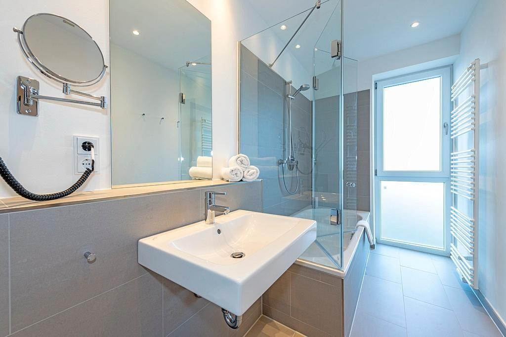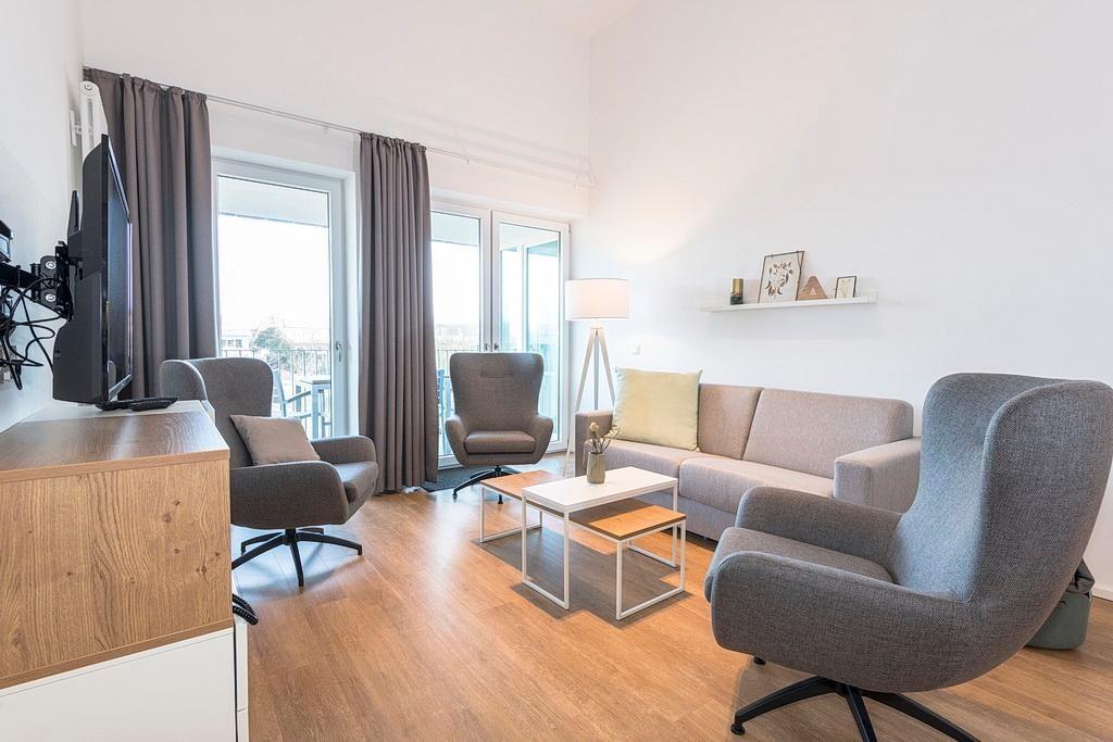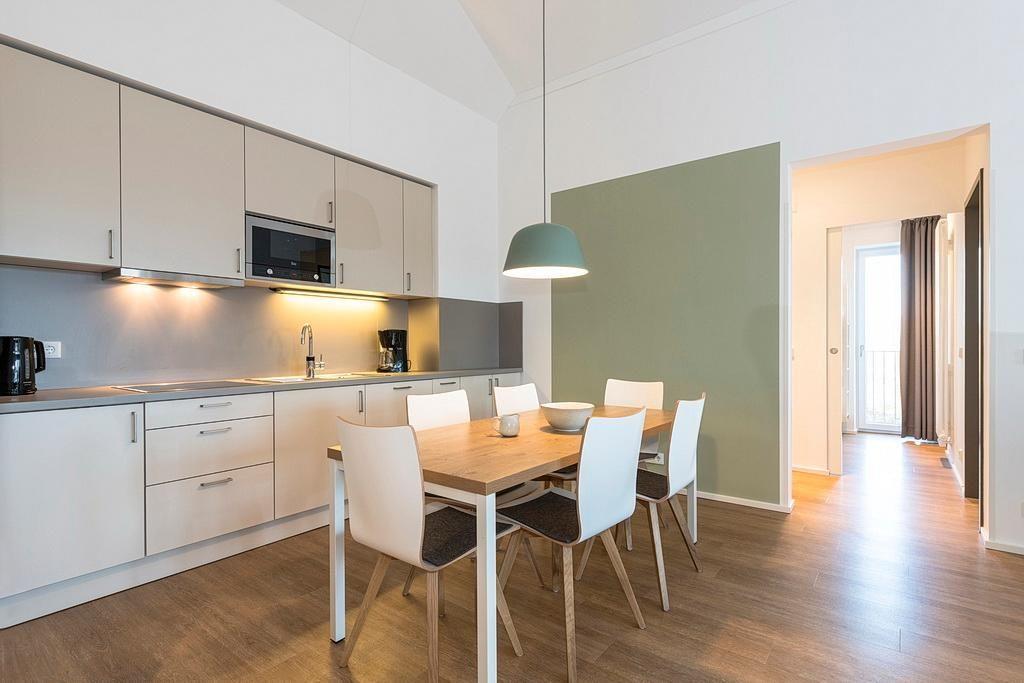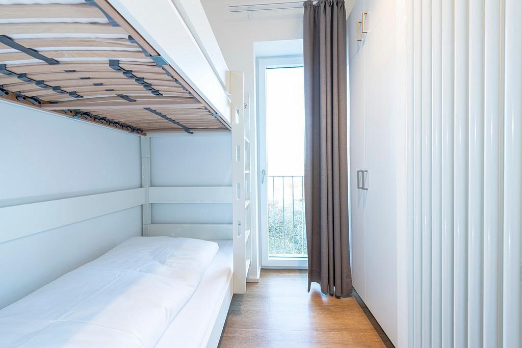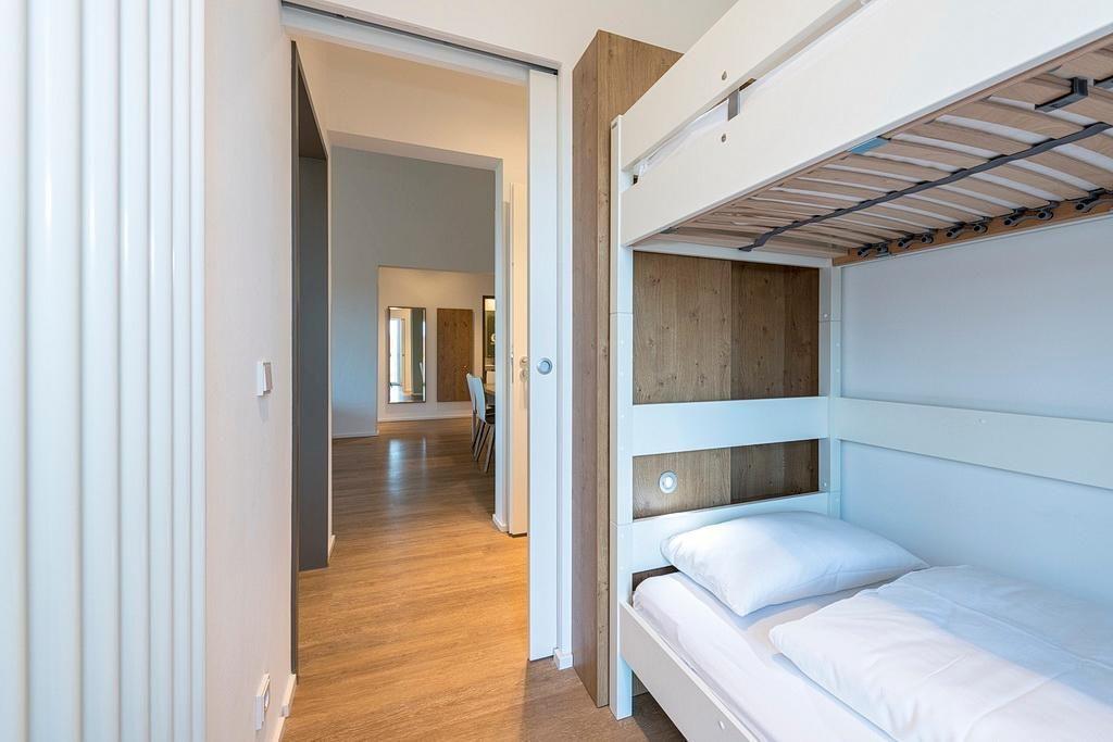 Das hochwertige Nichtraucher-Apartment verfügt über kostenfreies WLAN. Der Wohnbereich bietet, neben einer Schlafcouch, eine voll ausgestattete offene Küche mit Geschirrspüler, Gefrierfach, Kaffeemaschine, Toaster, Wasserkocher und Mikrowelle mit Grillfunktion sowie einen großen Flatscreen-TV und Radio. Das Apartment verfügt über einen Esstisch für 6 Personen und einen behaglichen Sitzbereich. Drei separate Schlafzimmer stehen euch zur Verfügung. Zwei davon jeweils mit einem Doppelbett, eins zudem mit einem eigenem Flatscreen-TV und eins verfügt über einen direkten Zugang zum Balkon. Das dritte Schlafzimmer mit Etagenbett liegt unmittelbar neben einem der Badezimmer. Ein Kinderbett kann gegen Entgelt aufgestellt werden. In den beiden stilvollen Badezimmern befinden sich eine große begehbare Dusche bzw. eine Badewanne sowie ein Waschtisch mit Föhn und Kosmetikspiegel. Auf dem geschützten Balkon, nach Nord-West gelegen, lässt sich auch in großer Runde gemütlich beisammensitzen.