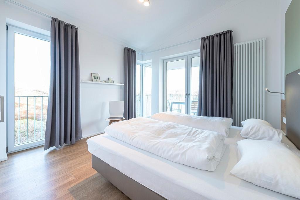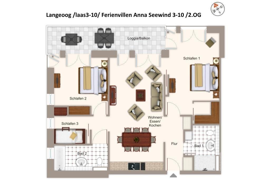 Das 98 m² große und barrierearme 4-Zimmer Apartment ist für bis zu 7 Personen geeignet. Besonders hervorzuheben ist der große überdachte Balkon, ähnlich einer Loggia, nach Nord-West ausgerichtet. Hier genießt ihr den ganzen Tag das wohltuende Nordseeklima. Darüber hinaus verfügt das Apartment über zwei Bäder.