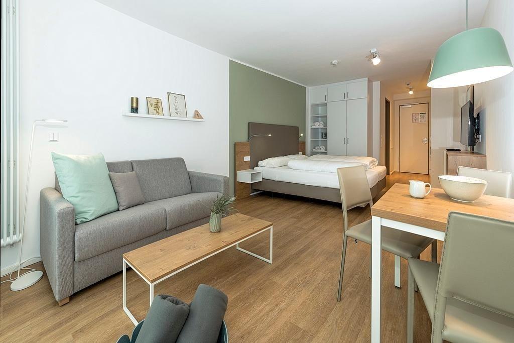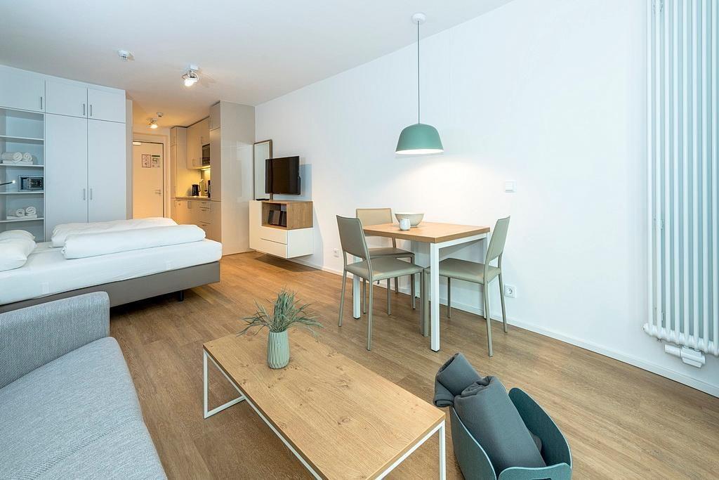 Das barrierearme Nichtraucher-Apartment verfügt über kostenfreies WLAN. Der Wohn- und Schlafraum bietet eine voll ausgestattete offene Küchenzeile mit Geschirrspüler, Gefrierfach, Kaffeemaschine, Toaster, Wasserkocher und Mikrowelle mit Grillfunktion sowie ein Doppelbett und eine Schlafcouch, einen großen Flatscreen-TV und Radio. Das Apartment verfügt über einen kleinen Esstisch und einen behaglichen Sitzbereich. Ein Kinderbett kann gegen Entgelt aufgestellt werden. Im stilvollen Badezimmer befinden sich eine große begehbare Dusche sowie ein Waschtisch mit Föhn und Kosmetikspiegel. Nach einem erholsamen Urlaubstag lässt es sich auf der mit Gartenmöbeln ausgestatteten Terrasse herrlich entspannen.