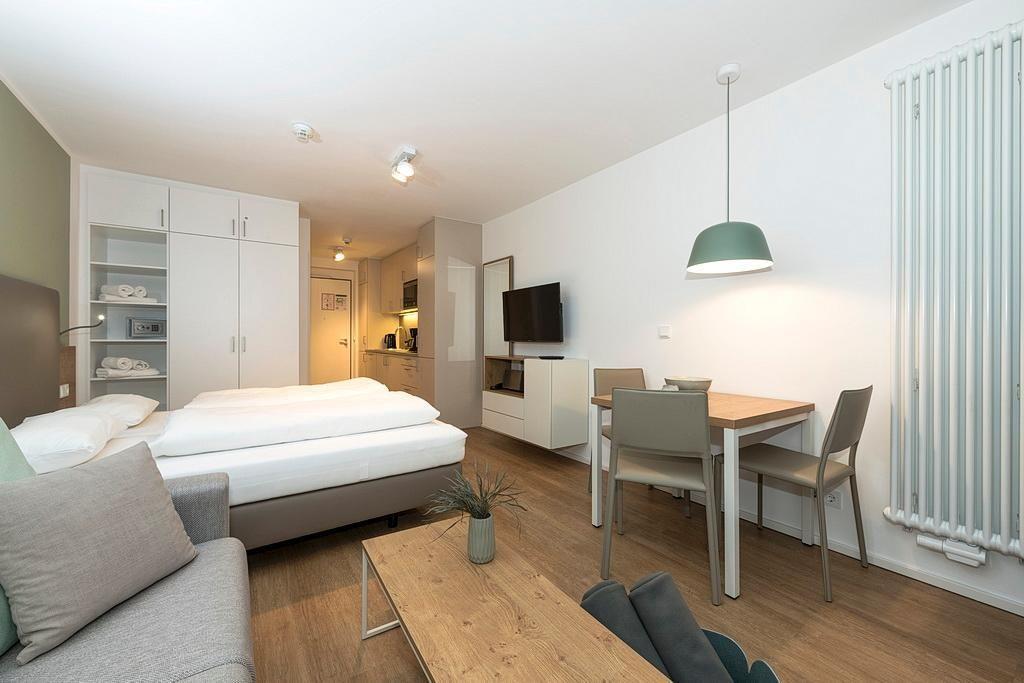 Das barrierearme Nichtraucher-Apartment verfügt über kostenfreies WLAN. Der Wohn-Schlafraum bietet eine voll ausgestattete offene Küchenzeile mit Geschirrspüler, Gefrierfach, Kaffeemaschine, Toaster, Wasserkocher und Mikrowelle mit Grillfunktion sowie ein Doppelbett, eine Schlafcouch einen großen Flatscreen-TV und Radio. Das Apartment verfügt über einen kleinen Esstisch und einen behaglichen Sitzbereich. Ein Kinderbett kann gegen Entgelt aufgestellt werden. Im stilvollen Badezimmer befinden sich eine große begehbare Dusche sowie ein Waschtisch mit Föhn und Kosmetikspiegel. Nach einem erholsamen Urlaubstag lässt sich auf der mit Gartenmöbeln ausgestatteten Terrasse in West-Lage herrlich entspannen.