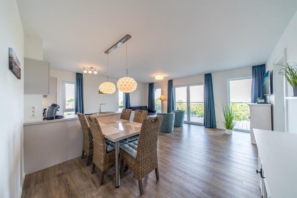 Das 79 m² große 3-Zimmer-Apartment ist für 5 Personen geeignet. Besonders hervorzuheben ist hier die einmalige Lage direkt am Deich und der Meerblick vom großzügigen Balkon des Apartments - weit über den Deich bis zum Strand und zur Nordsee. Besonders reizvoll: Das stilvolle Apartment verfügt über eine eigene Sauna im Badezimmer des exklusiven Apartments.