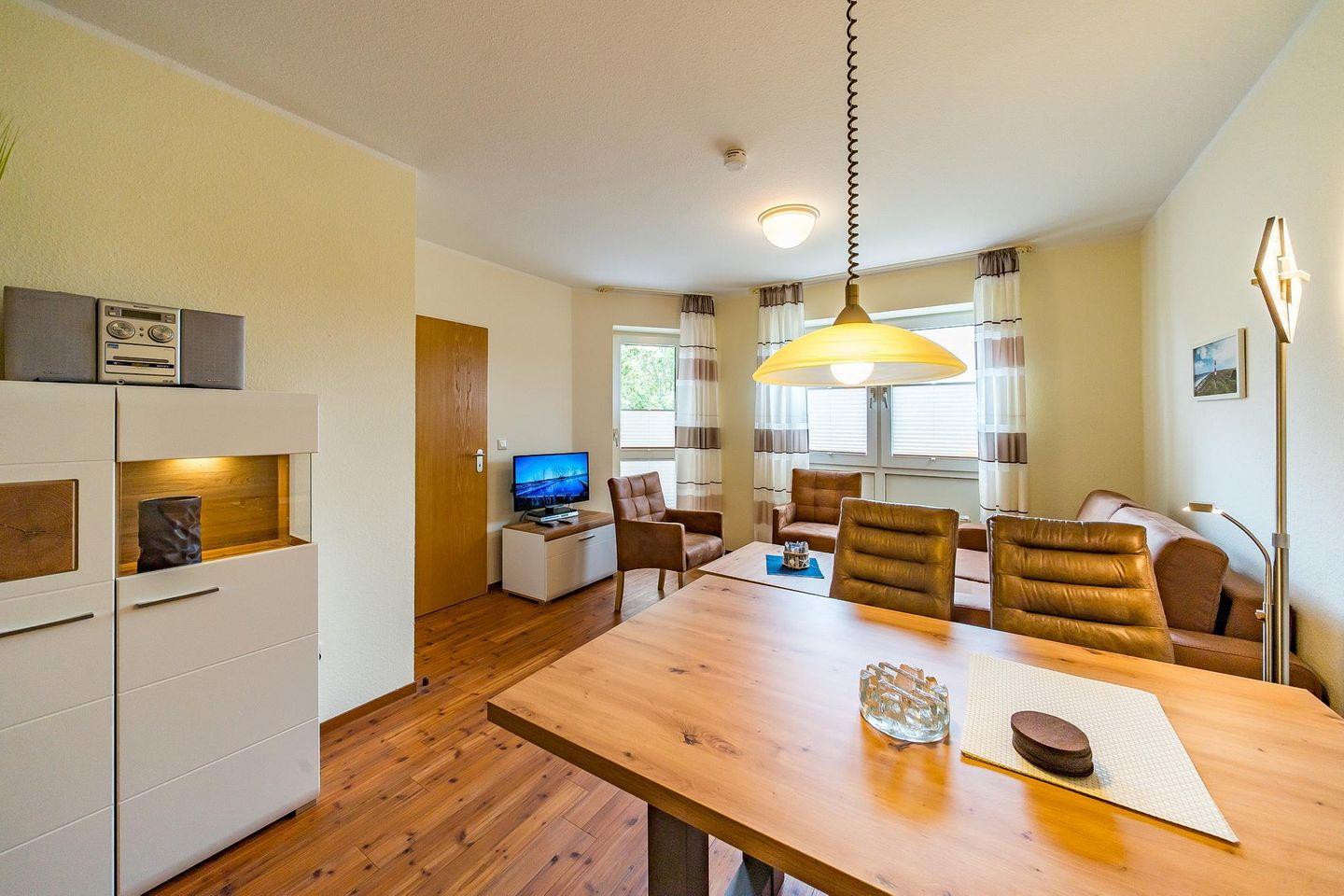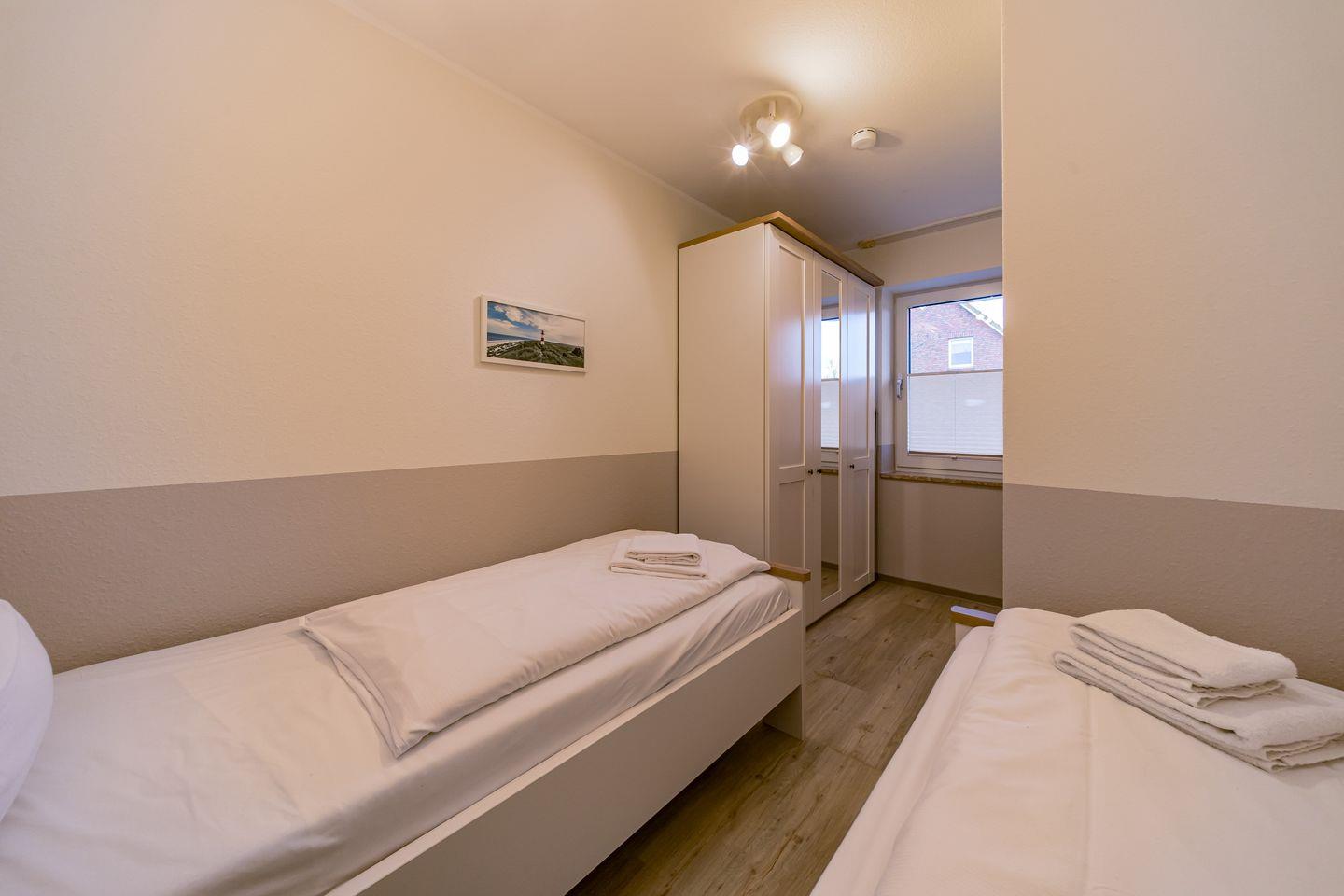 Ein Schlafzimmer mit 2 Einzelbetten, ein Wohnbereich mit Doppelschlafcouch und der Balkon mit westlichem Landblick auf Schillig ergeben die Konzeption des Apartments.