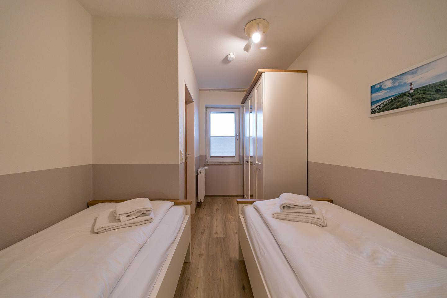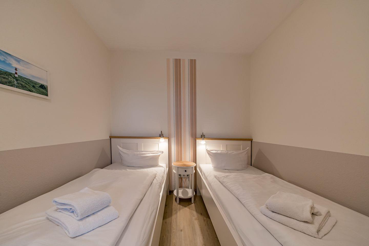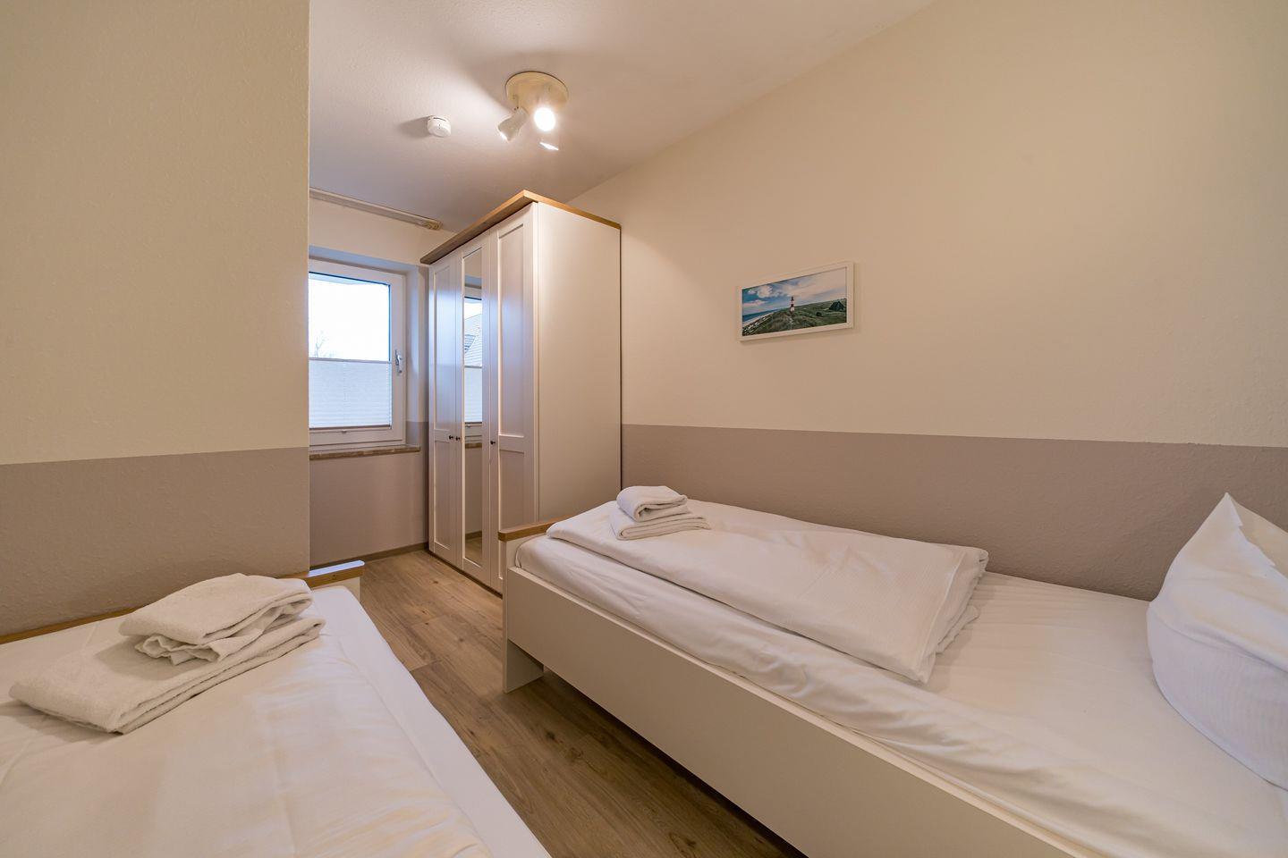 Zur Konzeption des Apartments gehören ein Schlafzimmer mit 2 Einzelbetten, ein Wohnbereich mit Doppelschlafcouch und ein Balkon mit westlichem Landblick auf Schillig.