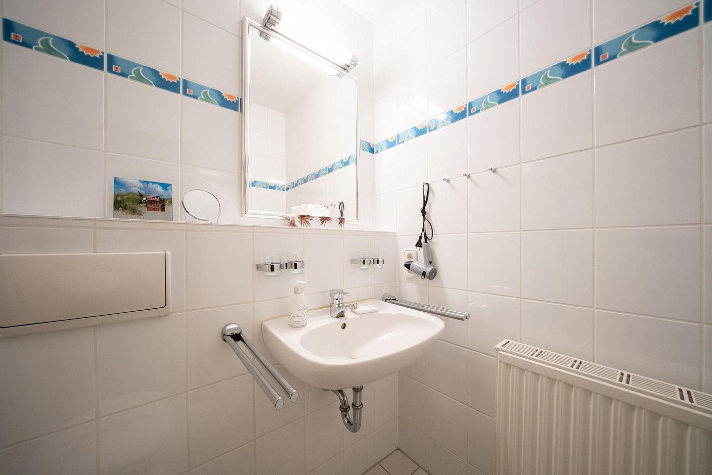 Die angrenzende abgetrennte Küche bietet Mikrowelle, Backofen, Kaffeefilter- und Kaffeepadmaschine, Toaster, Handstaubsauer, Mixer, Eier- und Wasserkocher und einen Kühlschrank mit Gefrierfach. Überdies verfügt das Apartment über Bügeleisen/-brett und Wäscheständer. Im Badezimmer mit WC und Dusche befindet sich ein Waschbecken mit Kindertritt sowie ein Föhn. Nach einem erlebnisreichen Urlaubstag lässt es sich auf dem mit Gartenmöbeln für vier Personen und Sonnenschirm ausgestatteten Balkon entspannen. Der Balkon ist vom Wohn-/ Essbereich zugänglich.