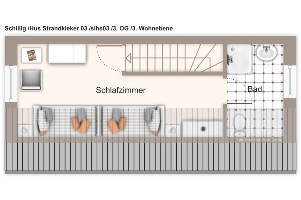 Das zweite Schlafzimmer befindet sich auf der dritten Wohnebene und verfügt über zwei Einzelbetten. Auf dieser Etage liegt auch das zweite Badezimmer. Beide Badezimmer verfügen jeweils über Dusche, WC, Waschbecken, Handtuchheizkörper, Föhn und Kosmetikspiegel.