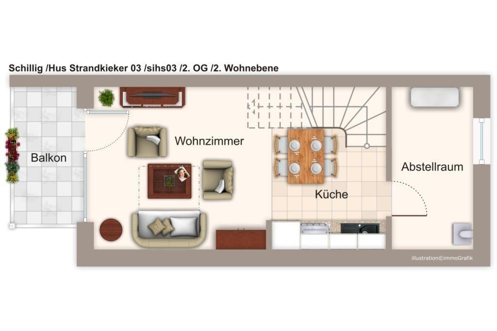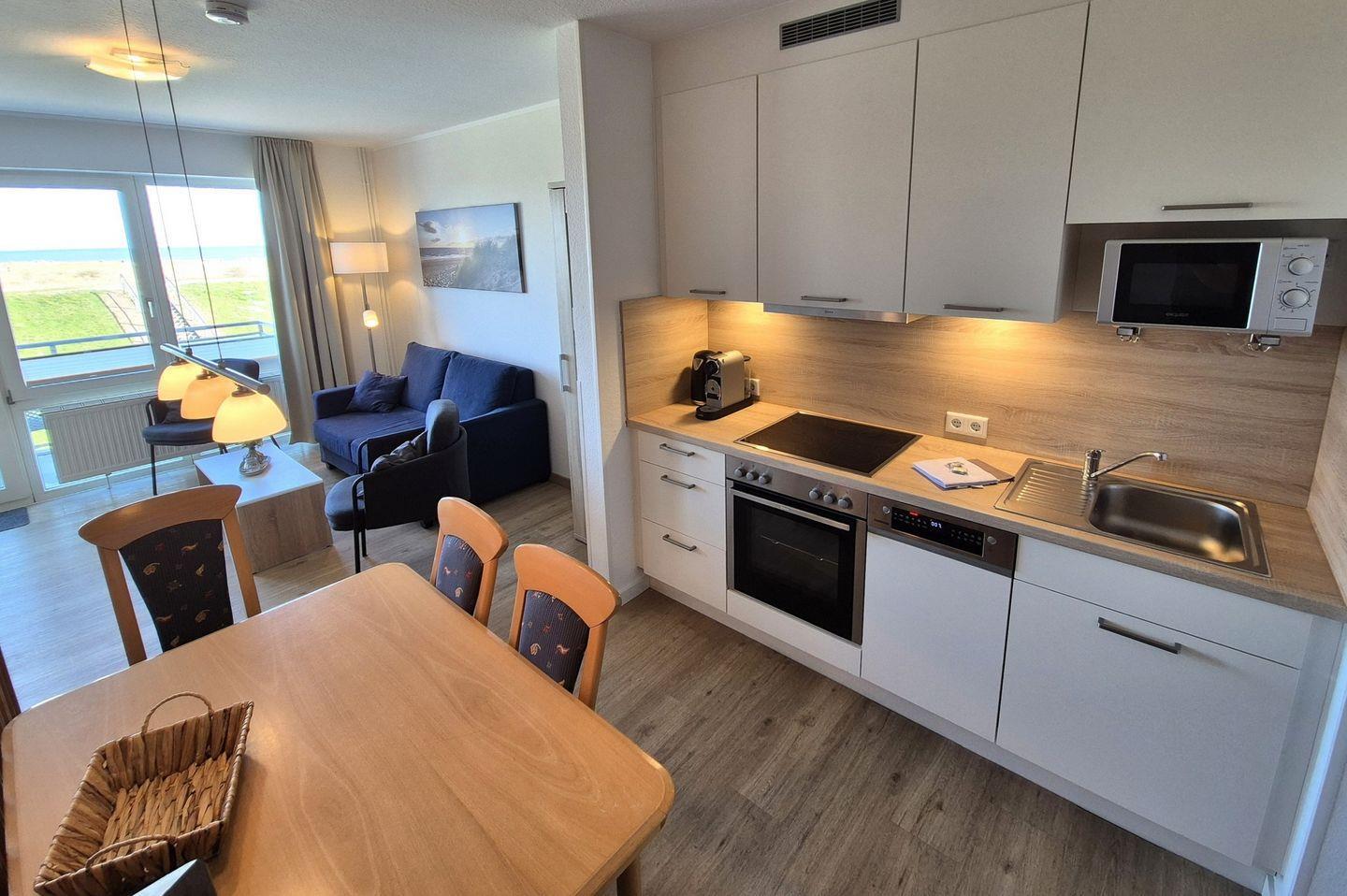 Auf der mittleren Wohnebene, im zweiten Obergeschoss, befindet sich die offene, voll ausgestattete Küche mit Essbereich und angrenzendem Abstellraum, Geschirrspüler, Kühlschrank, Gefrierfach, 4-Felder Ceranherd, Backofen, Kaffeefiltermaschine, Kaffeekapselmaschine (Nespresso), Eierkocher, Toaster, Wasserkocher und Mikrowelle. Hier liegt auch der Wohnbereich und der Balkon mit wunderschönem Blick zum Deich und zum Meer. Der Wohnbereich beinhaltet eine Schlafcouch (1,40 x 1,80 m) und bietet euch einen Flatscreen-TV sowie Gesellschaftsspiele und Bücher. Alle Schlaf- und Wohnräume sind mit Verdunkelungsgardinen ausgestattet. Die Wohnung verfügt über kostenfreies WLAN.