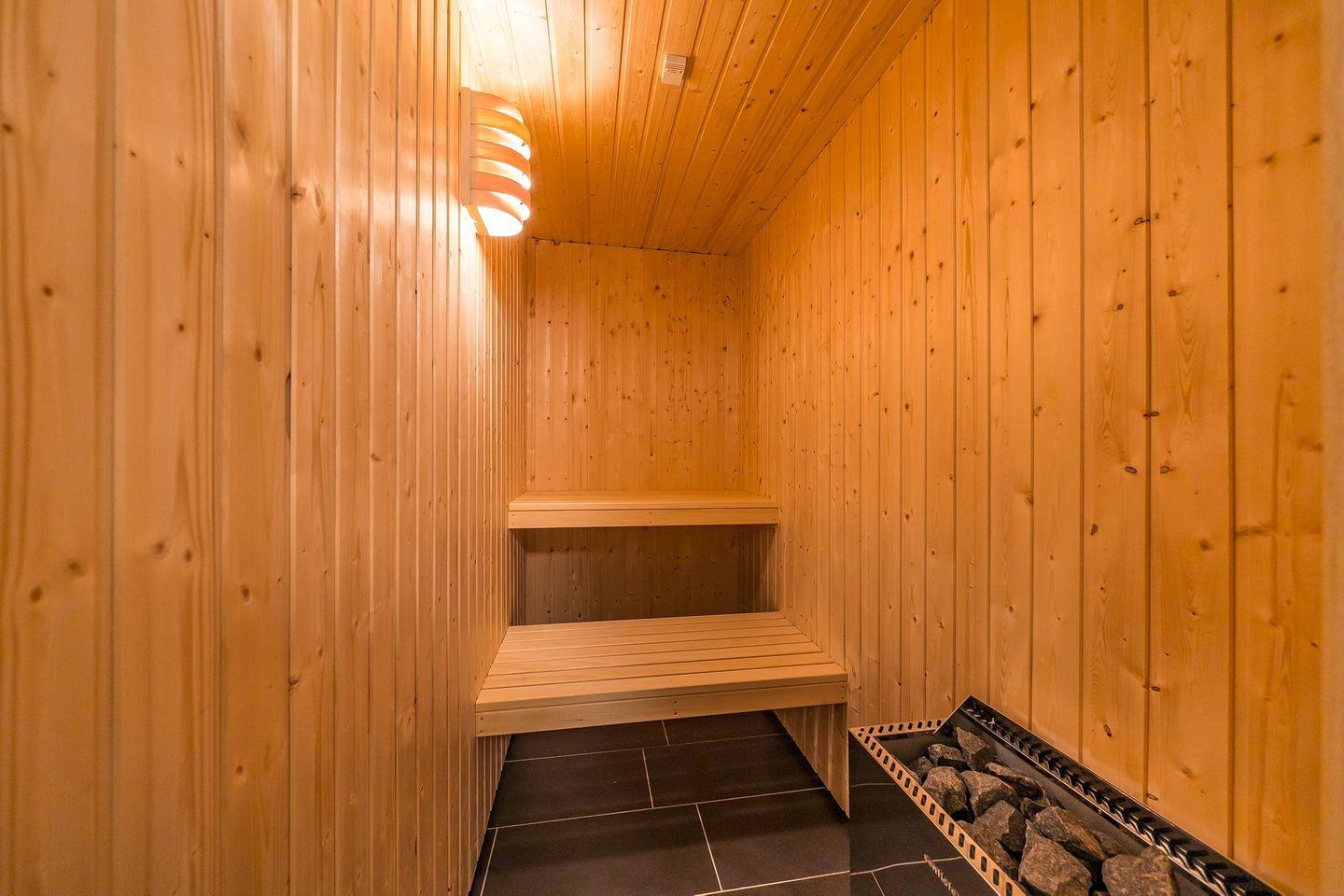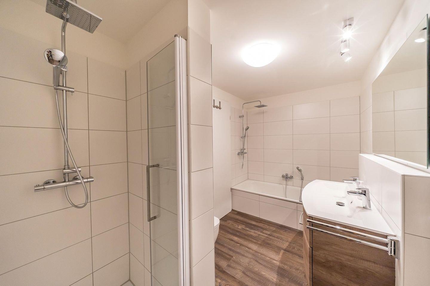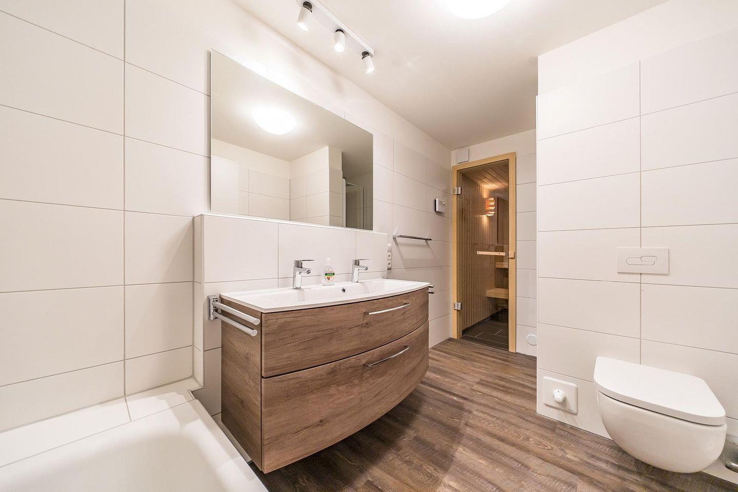 Ein stilvolles Badezimmer mit Badewanne, Tageslicht, Dusche, WC, Doppelwaschtisch, Kosmetikspiegel und Föhn sowie ein separates Gäste-WC stehen euch zur Verfügung. Ein weiteres Highlight ist die eigene Sauna im Badezimmer des Hauses.