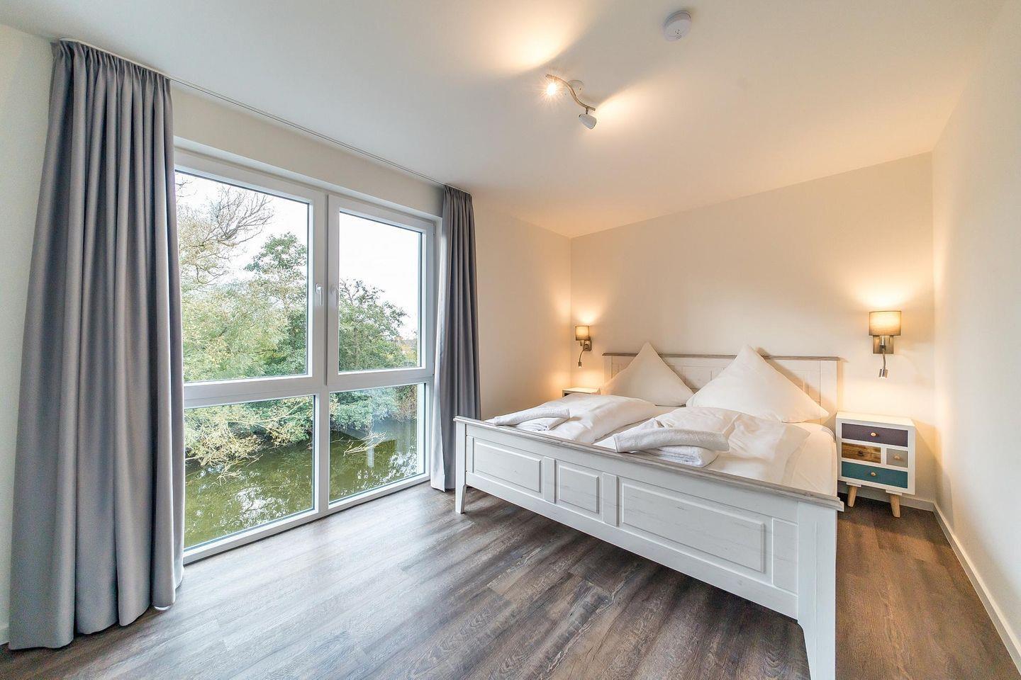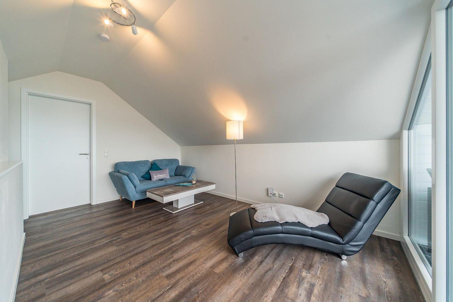 Bereits beim Frühstück könnt ihr auf der großzügigen und südlich gelegenen Terrasse die idyllische Lage am Wasser genießen. Die Terrasse ist vom Wohnbereich aus begehbar. Ein überdachter Balkon nach Norden gelegen und mit Blick zum Meer und dem vorgelagerten Deich verspricht Nordseefeeling pur. Der überdachte Balkon befindet sich im Dachgeschoss und ist von einem weiteren Wohnbereich aus begehbar.
