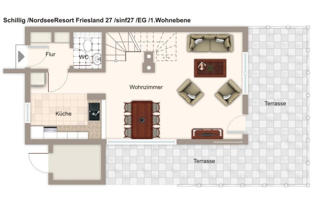 Das Reihenhaus über zwei Etagen verlaufend, liegt am Nordseedeich, im Nordseeheilbad Horumersiel-Schillig. Das Meer ist mit 200 m nur wenige Schritte entfernt – ideal für alle, die Strand, Sonne und das gesunde Nordseeklima lieben. Hier gibt es kaum Autoverkehr, dafür umso mehr Ruhe. Einkaufen, Essen gehen oder Eis genießen? Alles ist fußläufig erreichbar. Für kleine Abenteuer sorgen das Thalasso Meeres Spa in Horumersiel und der Wasserskilift Hooksiel. Familien-Tipp: Barfuß durchs Watt – eine geführte Wattwanderung begeistert Groß und Klein!