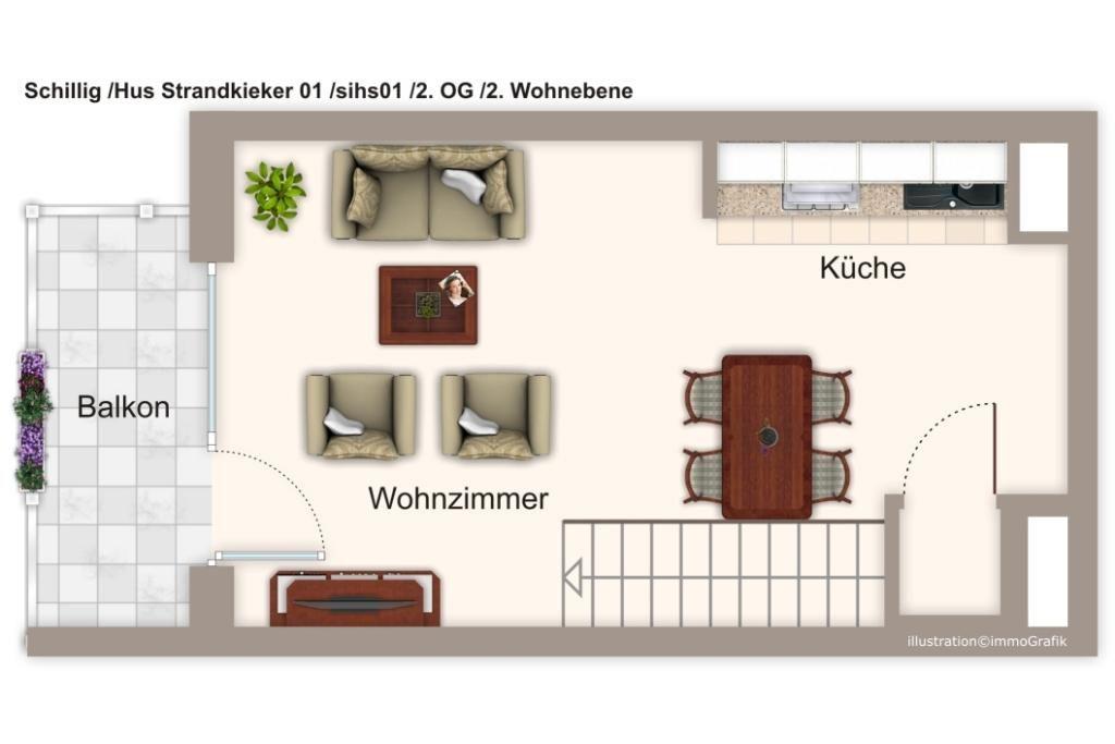 Beim „Hus Strandkieker“ in Schillig ist der Name Programm. Der Wohnbereich und Balkon des Maisonette-Apartments mit 2 Zimmern und 50 qm bietet einen wunderschönen Blick auf die Nordsee. 4 Personen können in der Wohnung auf 2 Ebenen einen individuellen Urlaub verbringen.