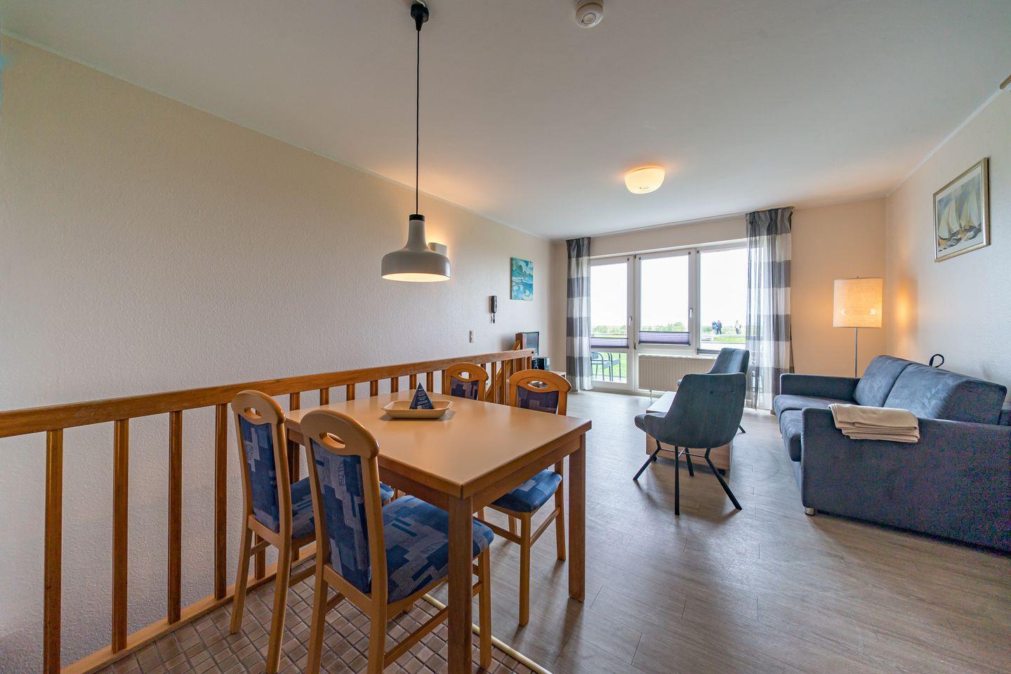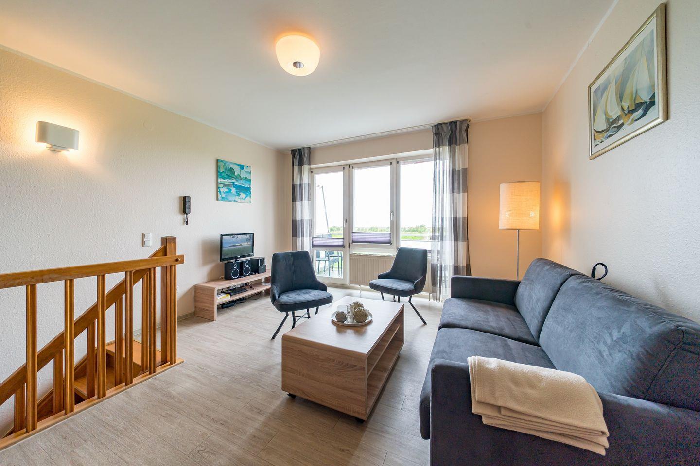 Das Apartment verfügt über kostenfreies WLAN. Die Aufteilung der zwei Ebenen ergibt sich aus Schlafbereich mit Doppelbett, Bad mit Dusche und Abstellraum auf der 1. Etage und Wohnbereich mit Doppelschlafcouch, offener Küche, Balkon mit Nordsee-Blick und weiterem Abstellraum auf der 2. Ebene.