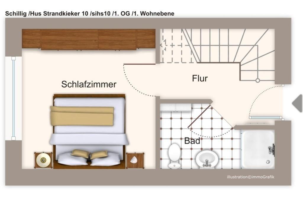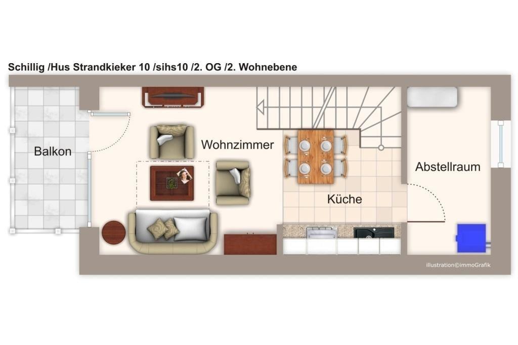 Das Apartment verfügt über kostenfreies WLAN. Die drei Ebenen des Feriendomizils ergeben sich aus einem Schlafbereich mit Doppelbett, Badezimmer mit Regendusche und Abstellraum im ersten Obergeschoss sowie dem Wohnbereich mit offener Küche und Balkon mit Nordsee-Blick in der zweiten Etage. Auf der dritten Wohnebene befinden sich das zweite Schlafzimmer mit zwei Einzelbetten und ein weiteres Badezimmer mit Regendusche.