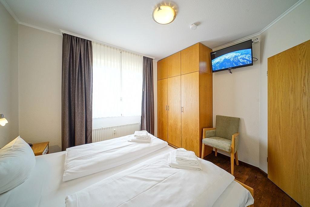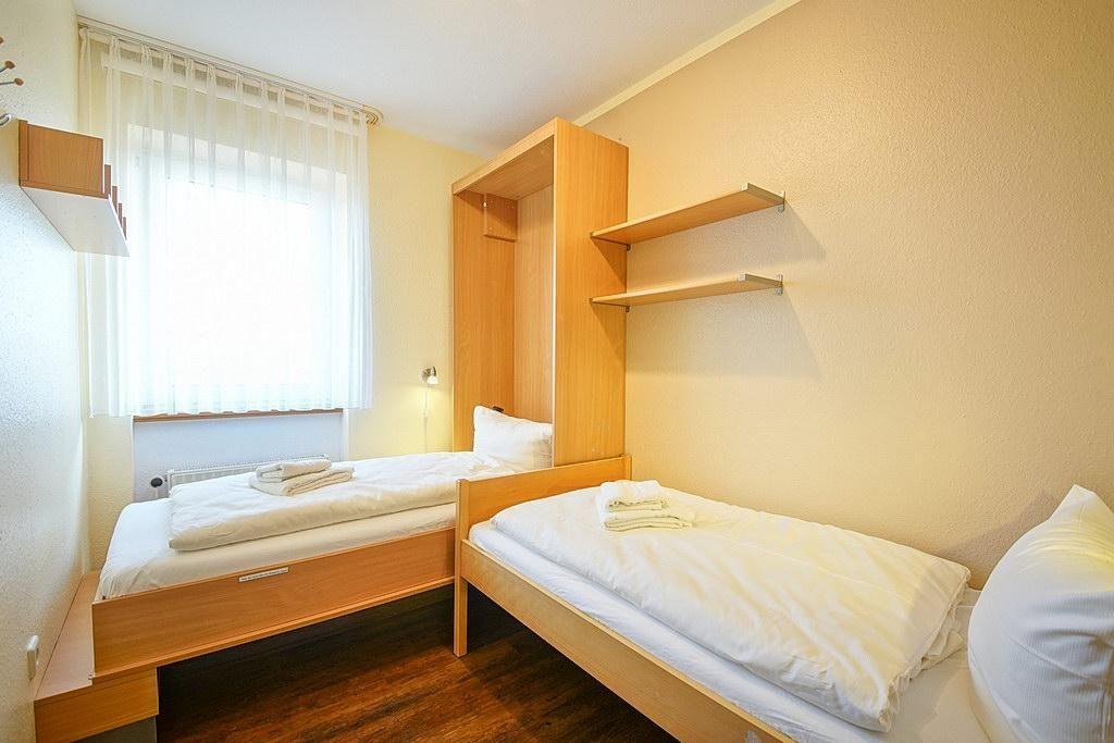Zur Konzeption der Maisonette-Wohnung die über 2 Etagen geht gehören ein Schlafzimmer mit Doppelbett und TV, zwei Einzelbetten, ein Wohnzimmer und ein Balkon mit malerischem Meerblick auf Schillig.