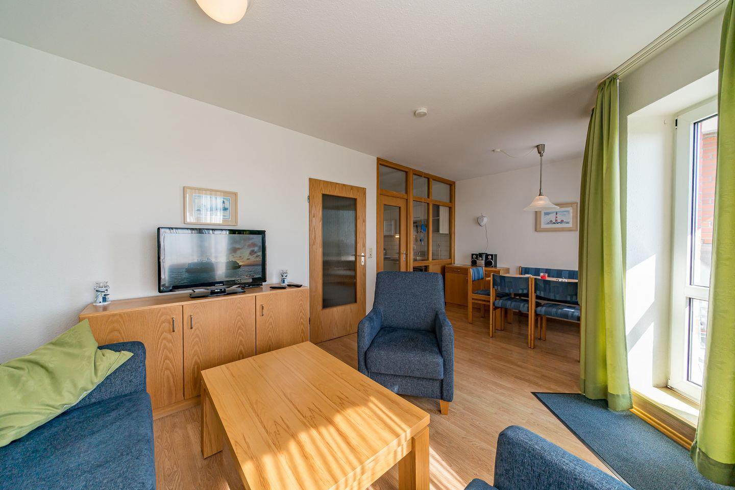 Über das 1. und 2. Obergeschoss auf der rechten Seite der Apartment-Anlage erstreckt sich die Maisonette-Ferienwohnung. Der kilometerlange Sandstrand befindet sich in nur 500 Metern Nähe. Cafés, Restaurants und Einkaufsmöglichkeiten erreicht ihr bequem zu Fuß oder mit dem Rad. Für Freizeitspaß sorgen das Thalasso Meeres Spa in Horumersiel und der Wasserskilift in Hooksiel.