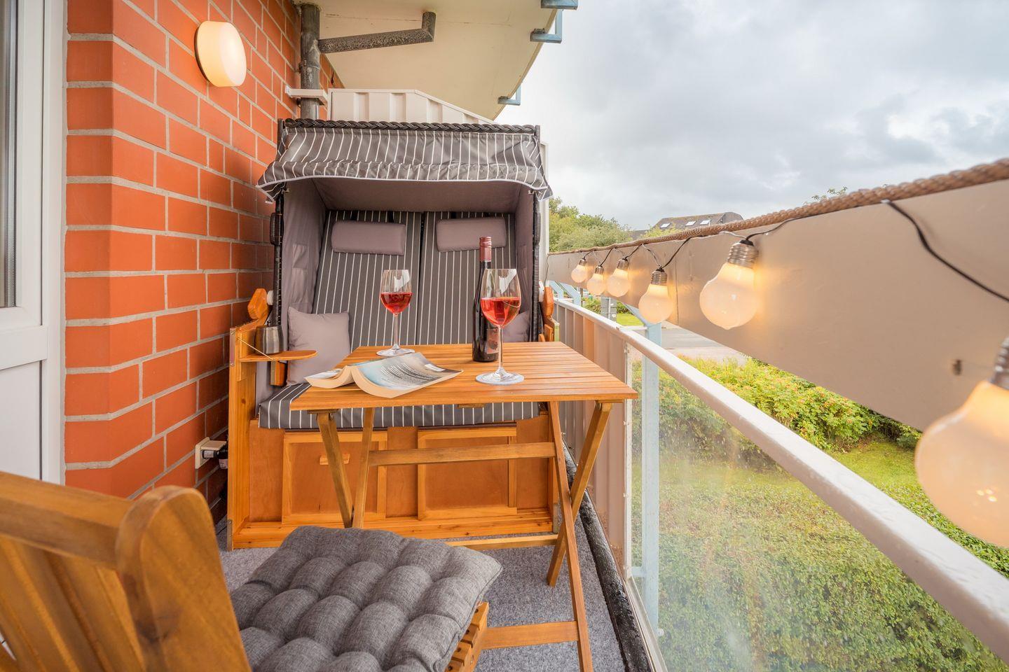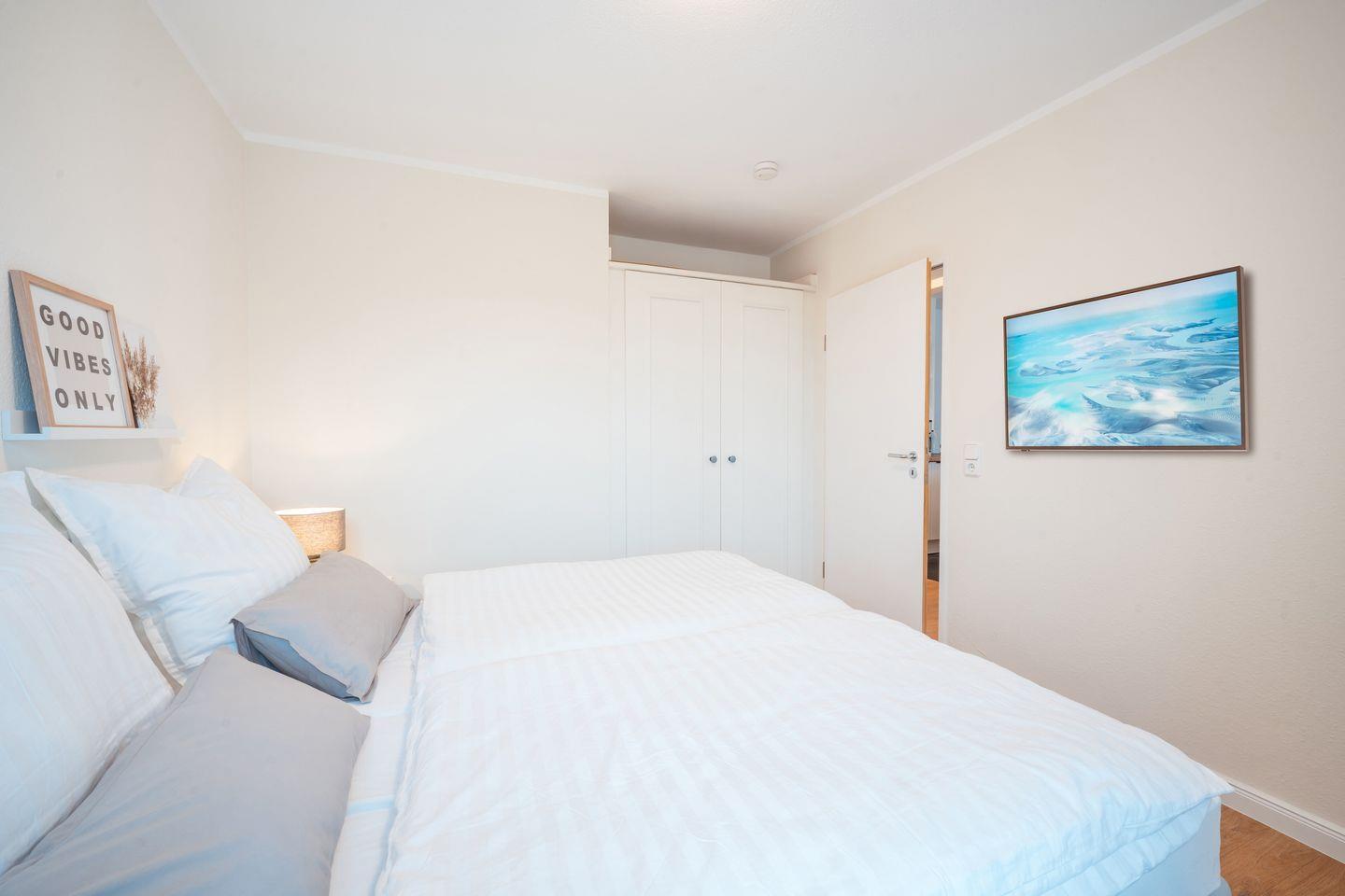 Das Apartment bietet euch zwei separate Schlafzimmer: Ein Schlafzimmer mit einem Doppelbett (1,80 x 2,00 m) und SMART-TV (43 Zoll) sowie einem Schlafzimmer mit zwei Einzelbetten (0,90 x 2,00 m) und SMART-TV (32 Zoll). Überdies verfügt die stilvolle Wohnung über einen Wohnbereich mit großem SMART-TV (55 Zoll) und über einen überdachten Balkon in Nord-West-Lage mit Strandkorb, Sonnenschirm, Gartenmöbeln und Blick auf den Nordseedeich. Das moderne Duschbad beinhaltet Waschtisch, Handtuchheizkörper, Kosmetikspiegel und Föhn.