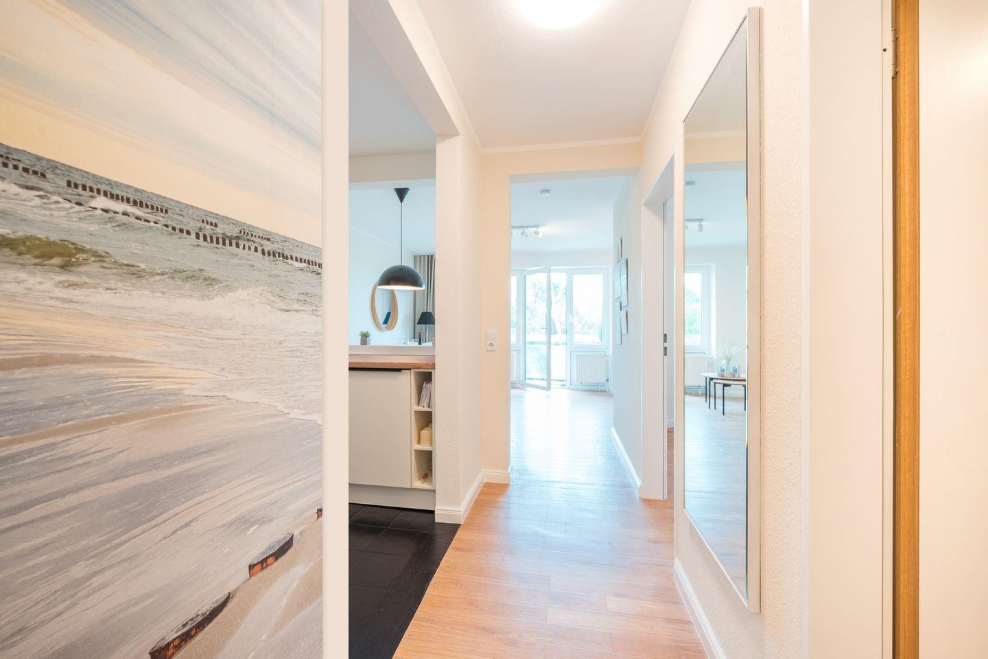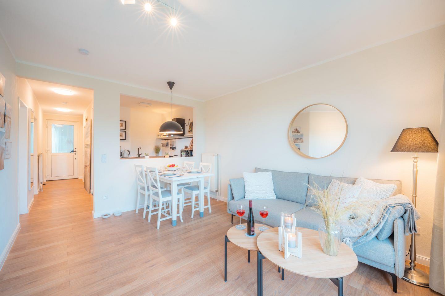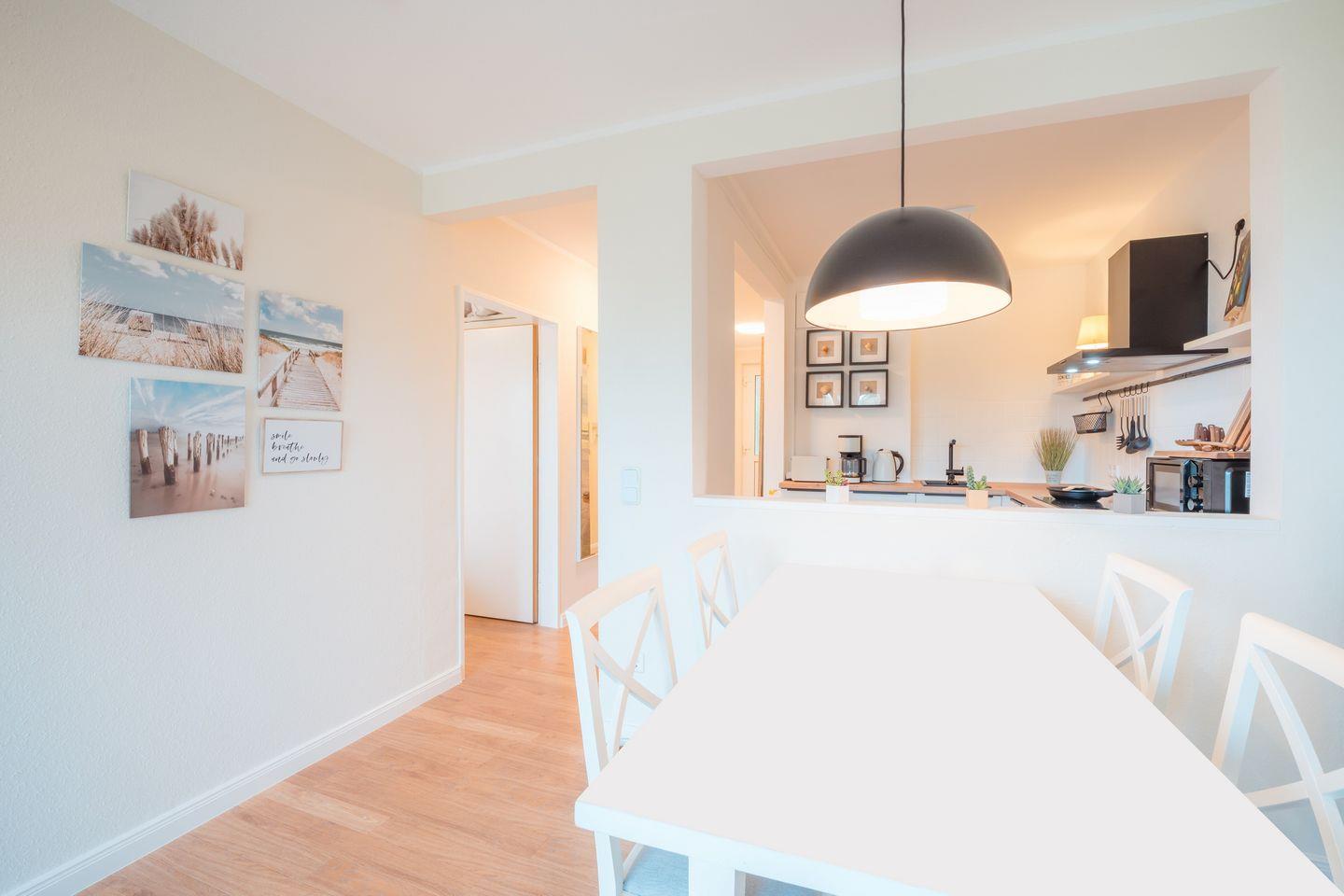 Im 1. Obergeschoss befindet sich das Apartment mit Blick ins Grüne und zum Nordseedeich in Nord-West-Lage. In der unmittelbaren Umgebung laden kleine Geschäfte, gemütliche Cafés und Restaurants zum Bummeln und Verweilen ein. Auch das 2.500 m² große Thalasso Meeres Spa in Horumersiel ist schnell erreicht – ideal für eine entspannte Auszeit am Meer.