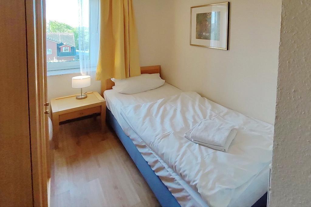 Das Feriendomizil verfügt über einen Schlafbereich mit Doppelbett, ein Kinderzimmer mit Einzelbett, einen Wohnbereich mit Doppelschlafcouch und einen Balkon mit eingeschränktem Blick zur Nordsee.