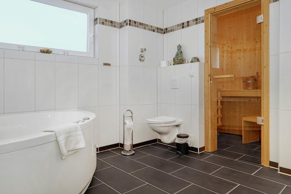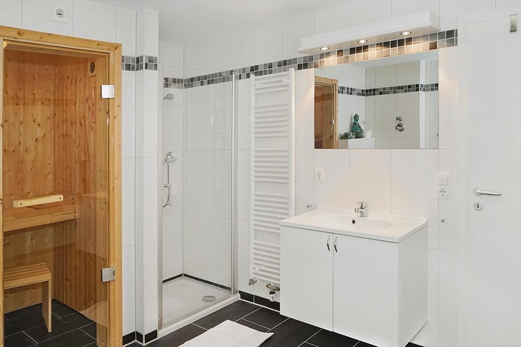 Das hochwertige Bad ist eine richtige kleine Wohlfühloase und verfügt über Fußbodenheizung, Sauna, Dusche, Handtuchwärmer und Föhn.