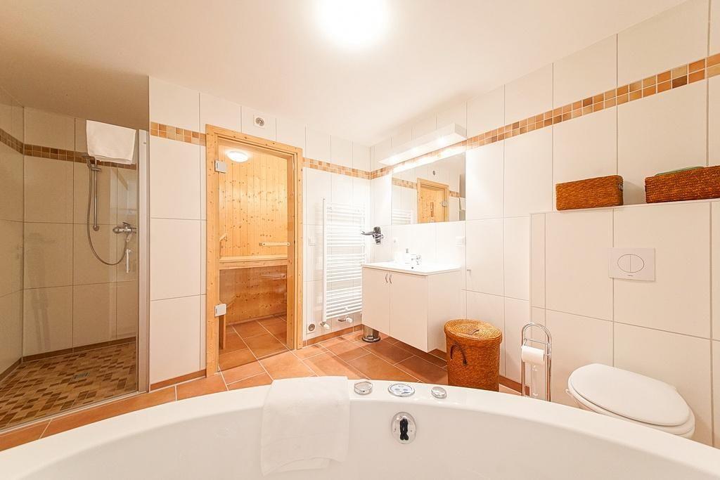 Zur kinderfreundlichen Ferienunterkunft zählen zwei Schlafzimmer mit einem Doppelbett bzw. zwei Einzelbetten, ein Wohnbereich, ein hochwertiges Bad mit Dusche, Whirlbadewanne, privater Sauna und ein Balkon. Das Kinderschlafzimmer verfügt über einen kleinen TV mit dem ausschließlich DVDs geschaut werden können.