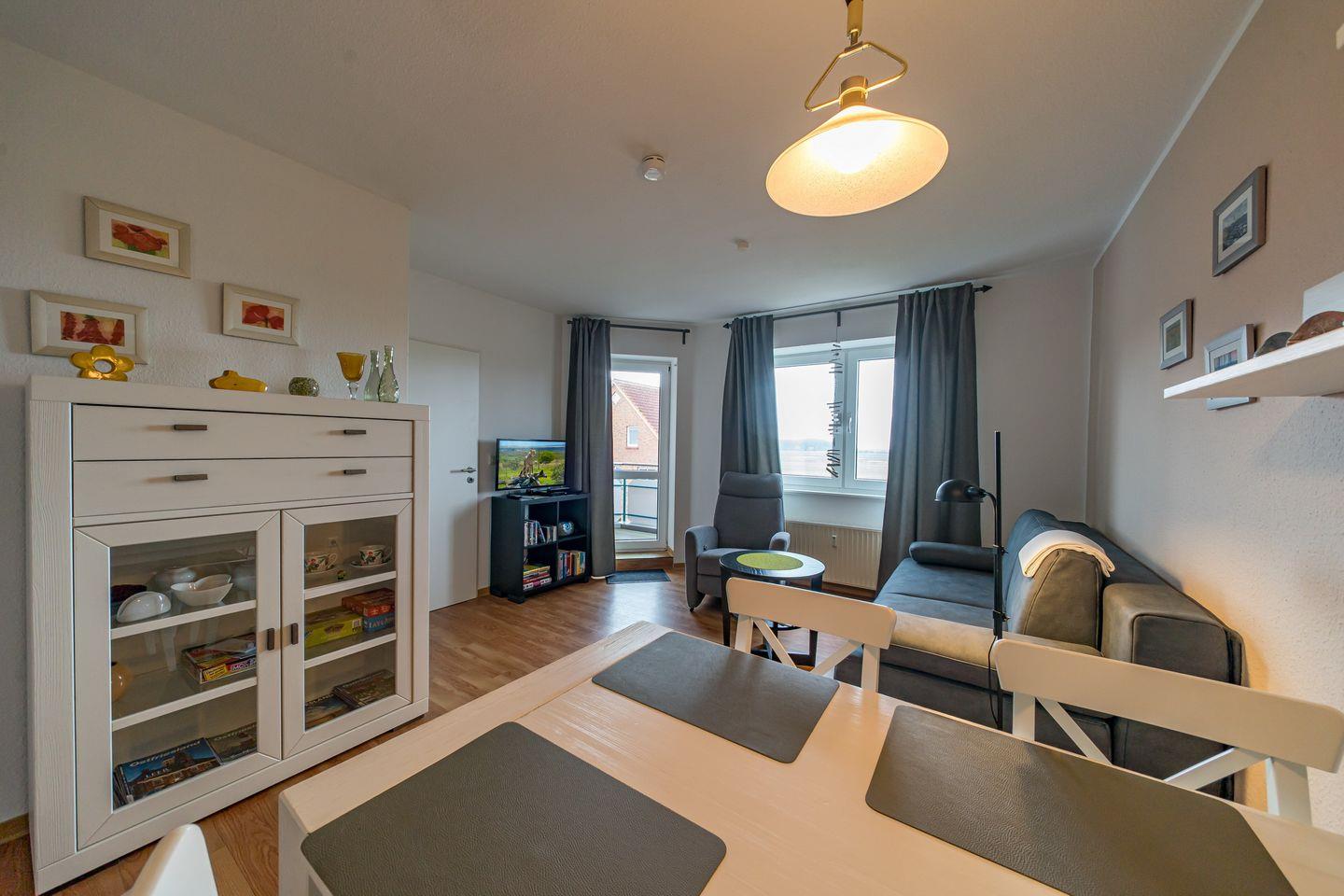 Strandnahe 2-Zimmer-Ferienwohnung mit Balkon und herrlichem Weitblick im Hus Jadekieker, ideal für erholsame Tage an der Nordsee.