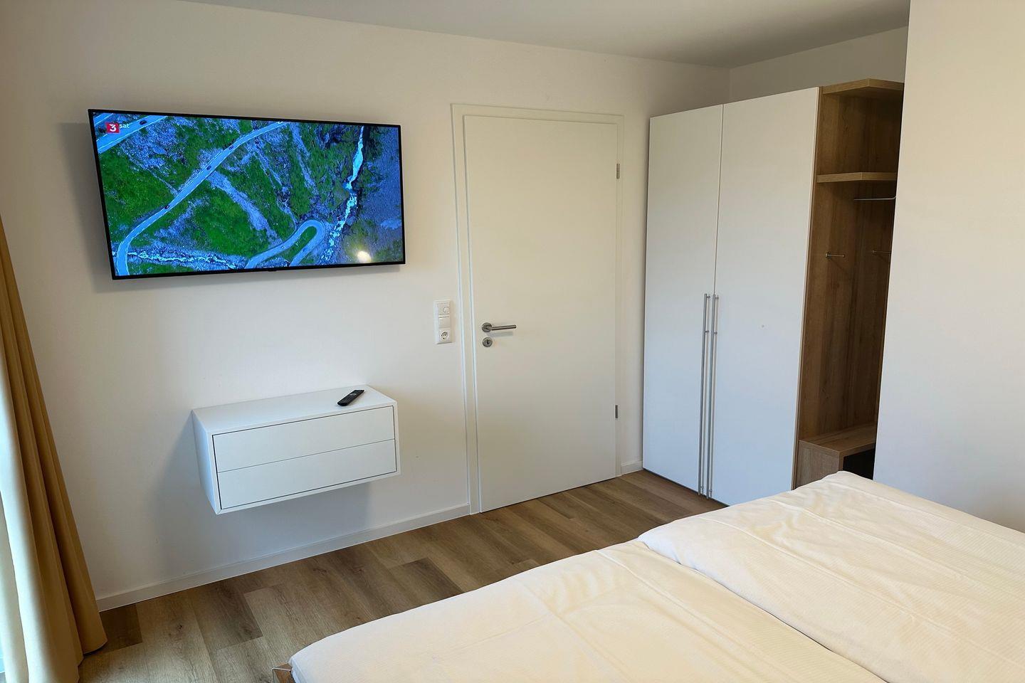 Im separaten Schlafzimmer mit Doppelbett (1,80 x 2,00 m) befindet sich ein zweiter großer Flatscreen-TV (50 Zoll). Das großzügige Tageslicht-Badezimmer bietet euch Fußbodenheizung, Badewanne, Regendusche, Waschbecken und WC und verfügt über Kosmetikspiegel und Föhn.