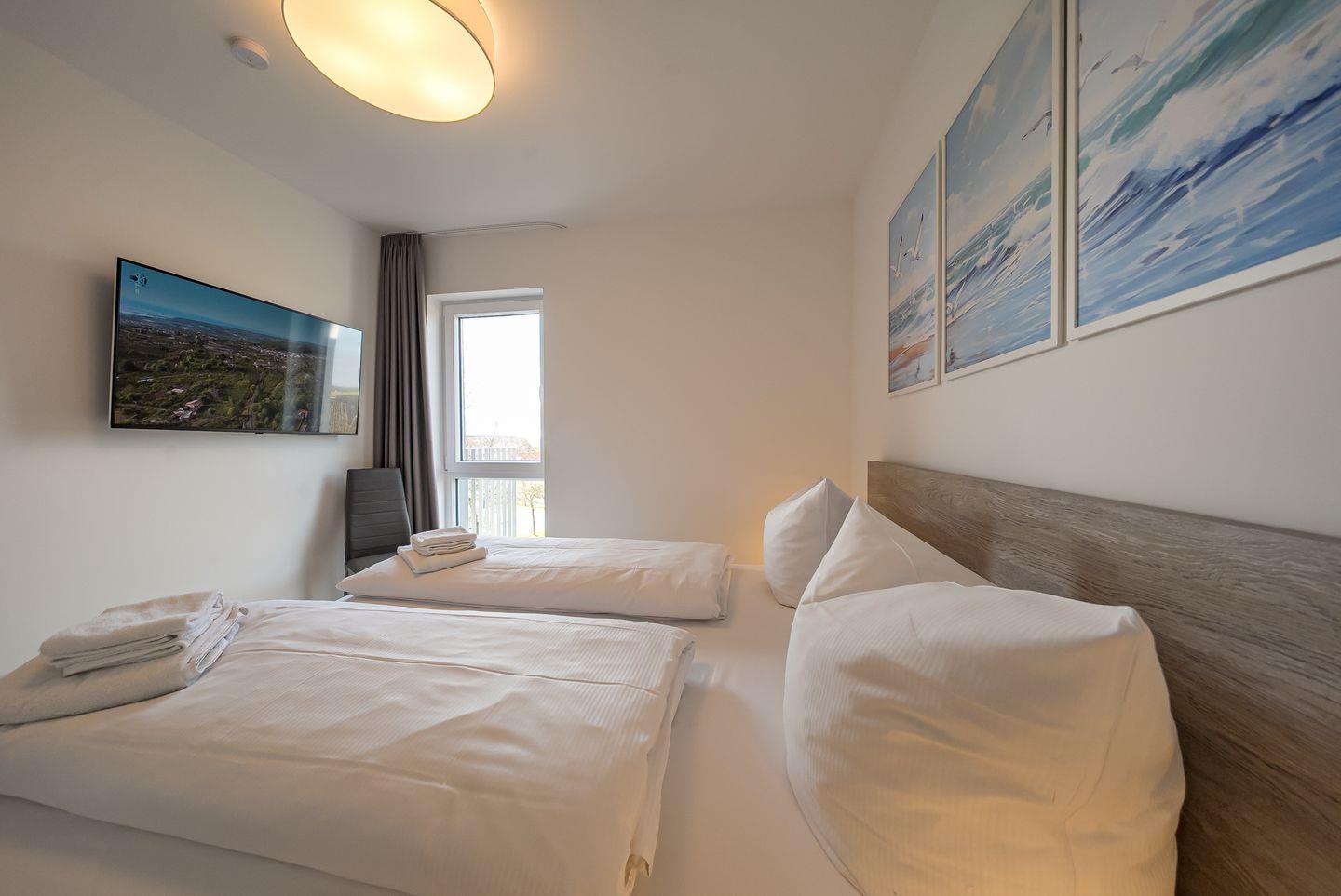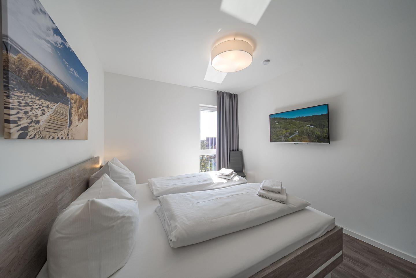 Es stehen euch zwei separate Schlafzimmer mit Doppelbett (1,80 x 2,00 m) und Kleiderschrank zur Verfügung. In beiden Schlafzimmern befindet sich ein eigener SAT-TV (43 Zoll) und es kann auf Wunsch und gegen Entgelt ein Kinderbett aufgestellt werden. Das großzügige Tageslicht-Badezimmer mit Fußbodenheizung bietet euch eine private Sauna, Badewanne, ebenerdige Regendusche, Waschbecken und WC und verfügt über einen Föhn.