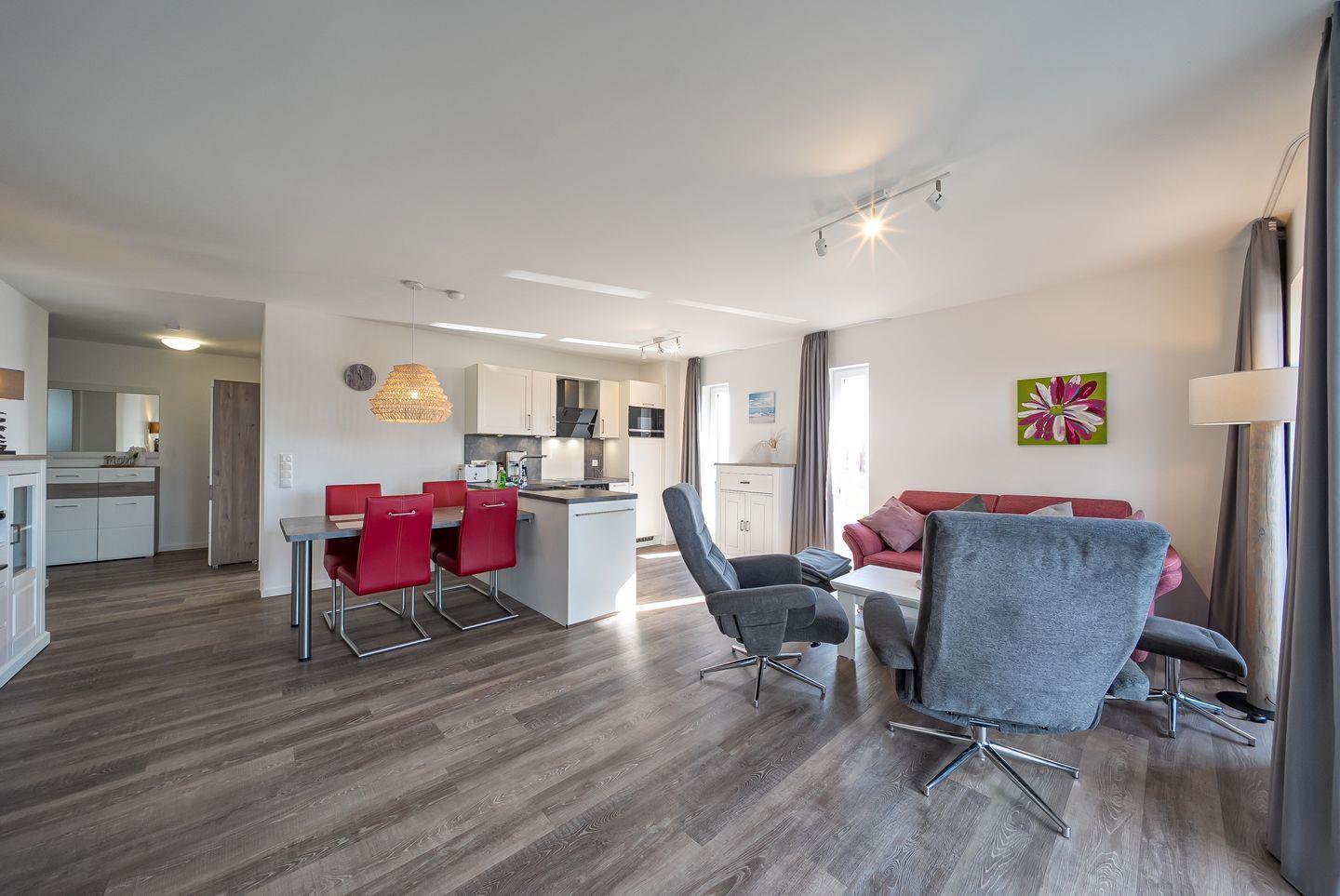 Das 81 m² große 3-Zimmer-Apartment ist für bis zu 6 Personen mit Familienhund geeignet. Besonders hervorzuheben sind die private Sauna und die sonnige Lage Das lichtdurchflutete Apartment mit Blick bis zum Deich ist nur ca. 200 m vom Strand gelegen und verfügt über einen Balkon in idyllischer Süd-Lage!