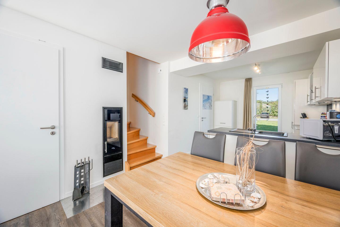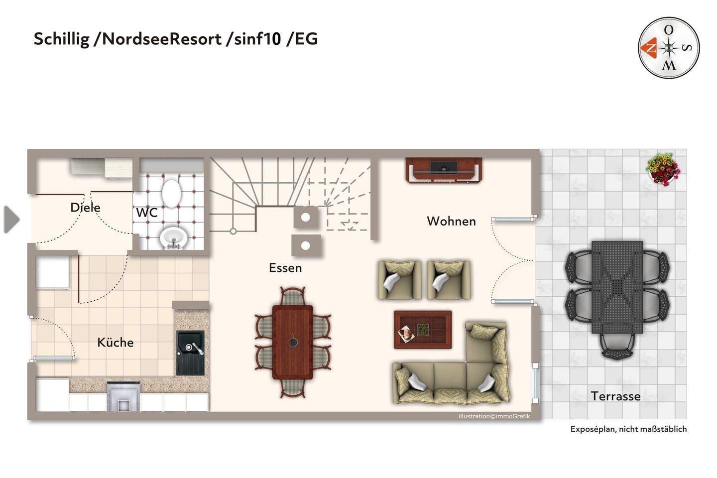 Im Erdgeschoss erreicht man über einen kleinen Windfang den hellen Wohnbereich. Die moderne Küche ist bestens ausgestattet mit Spülmaschine, Kühlschrank mit Tiefkühlfach, Ceranherd mit vier Kochfeldern, Backofen, Mikrowelle, Kaffeemaschine, Espressokocher, Milchaufschäumer, Wasserkocher, Eierkocher und Toaster. Geschirr, Gläser, Besteck, Töpfe, Pfannen sowie ein Raclette-Gerät sind ebenfalls vorhanden. Mittelpunkt dieser Etage ist der große Esstisch mit sechs Stühlen, der sowohl für gemeinsame Mahlzeiten als auch für gesellige Abende ideal geeignet ist. Der Kaminofen trägt zusätzlich zur gemütlichen Atmosphäre bei. Im hinteren Bereich, zur Terrasse gelegen, befindet sich eine Sofaecke mit Fernseher. Ein Gäste-WC komplettiert das Erdgeschoss. Die möblierte Südterrasse ist mit Tisch, sechs Sitzgelegenheiten und einem Sonnenschirm ausgestattet.